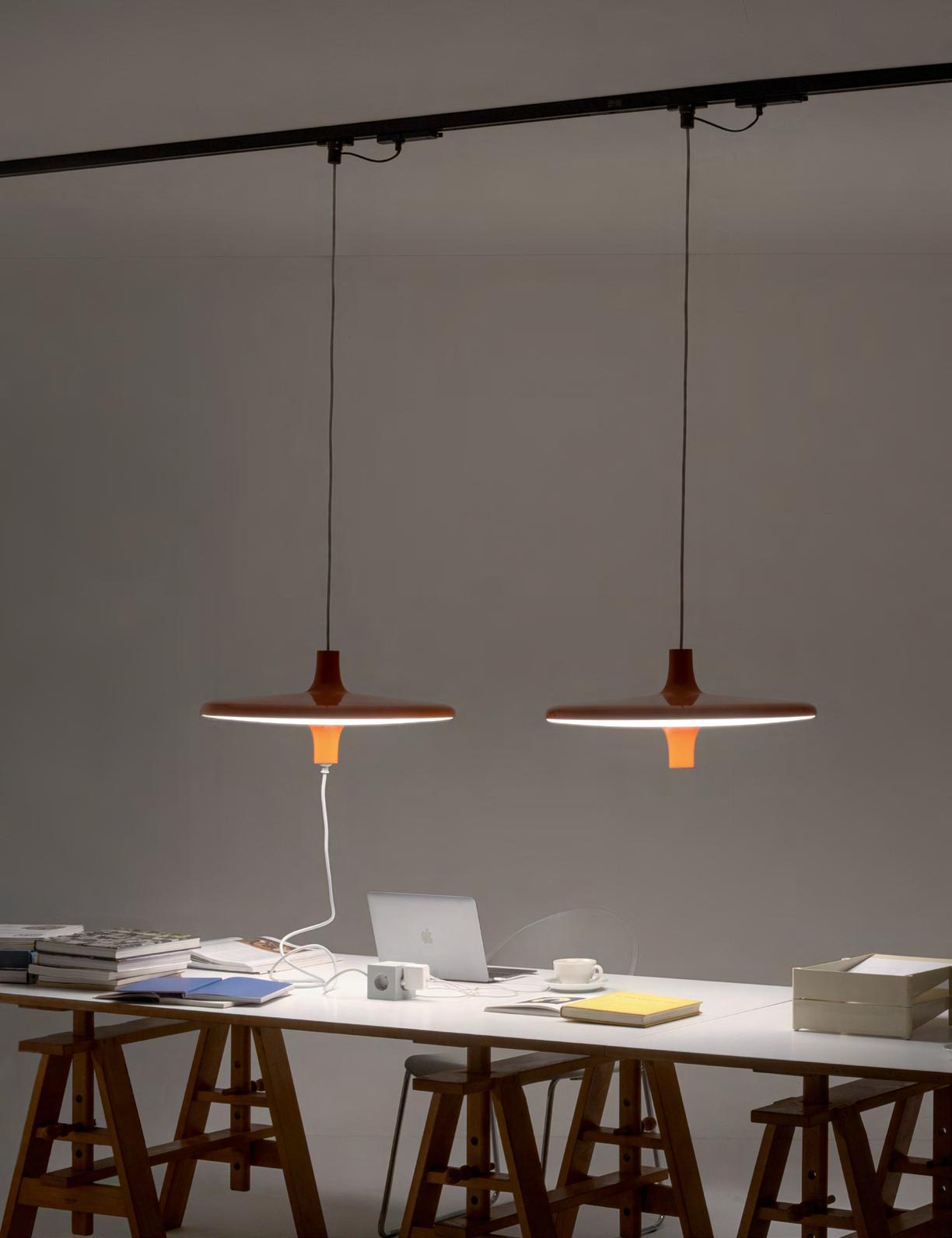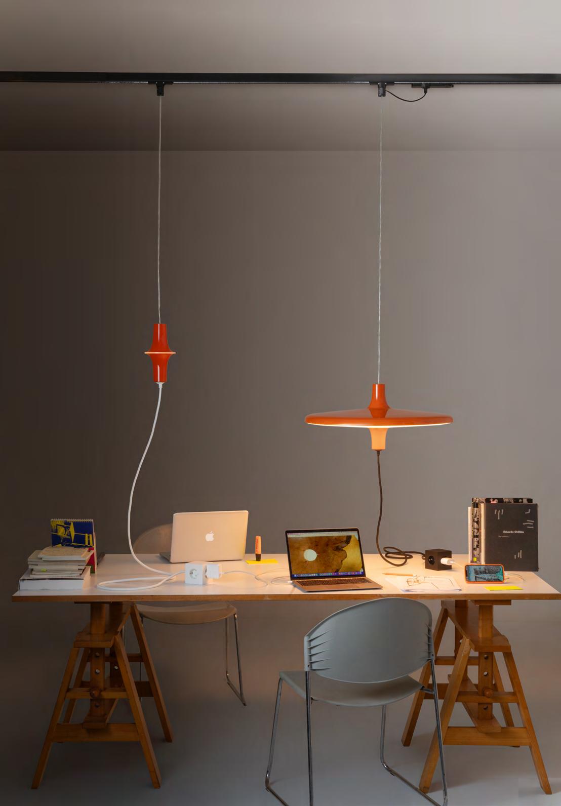 Con Avro la luce è esattamente dove la vuoi, la stagione di caccia alla presa elettrica è chiusa. Mangiare, lavorare o giocare sullo stesso tavolo non è più un problema. Ad ogni attività la sua luce grazie al diverso grado di luminosità che ottieni giocando con la dimmerazione. Il diffusore leggermente inclinato verso il basso ricorda le ali degli aerei Avro RJ-70, da cui la lampada prende il nome.