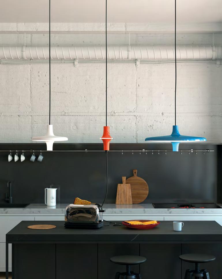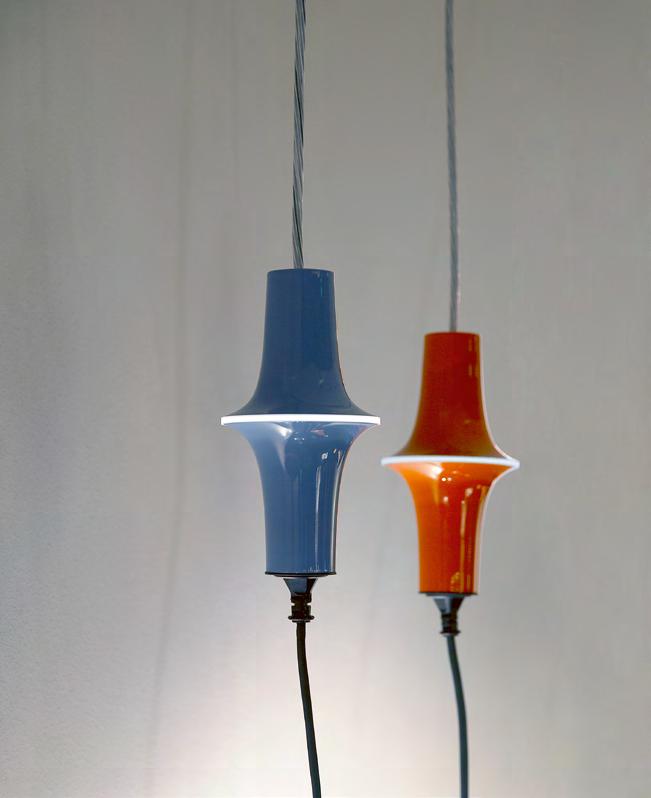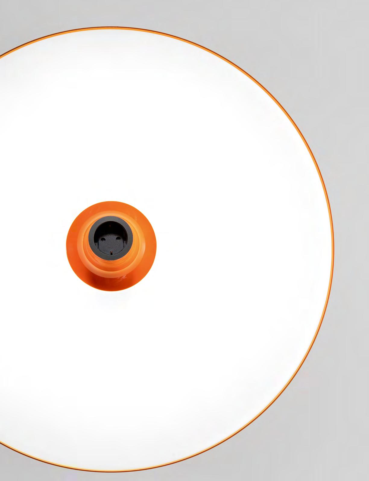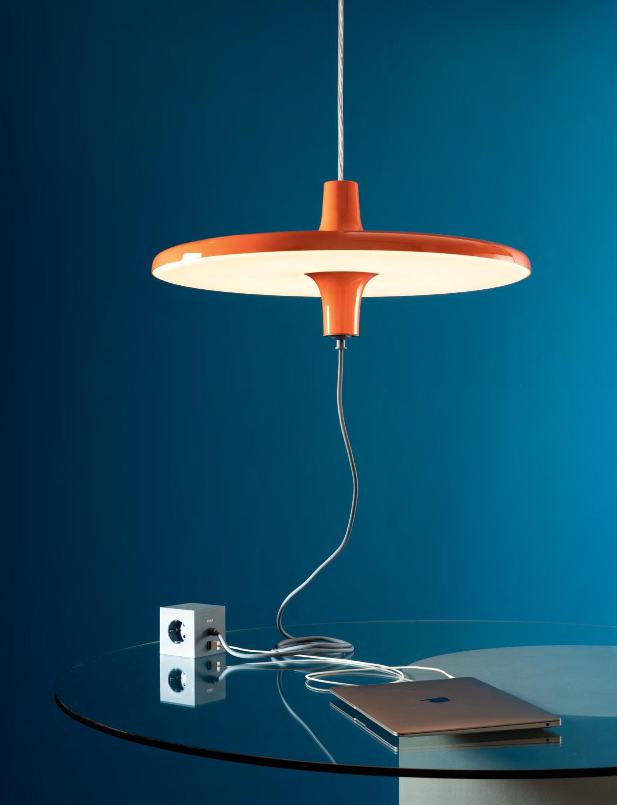 A feature of the Avro family is a Schuko socket mounted in the centre of the white opal methacrylate diffuser inside the aluminium support. Aluminium structure painted in white, black, blue and orange. Dimmable electronic power supply inside the ceiling mounting rose. Also available in a track-mounted version, see page 18.