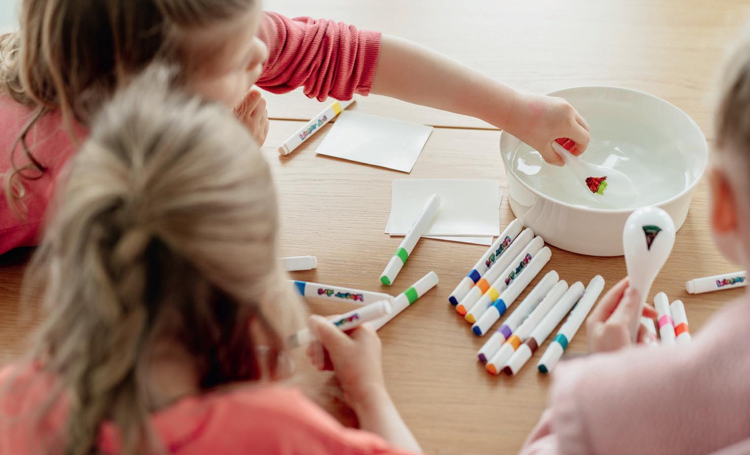 Piirrä tusseilla mukana tulevan lusikan takaosaan, kasta se kiertäen vesikulhoon ja katso, kuinka luomuksesi irtoaa lusikasta ja nousee kellumaan veden pinnalle. Hauskaa ja luovaa puuhastelua!