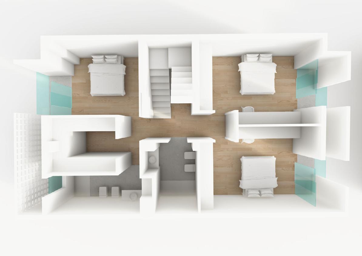 En esta planta se combina el porcelánico en las zonas húmedas como los baños y terrazas y se escoge la madera para el resto de dependencias, otorgándoles una mayor calidez a los dormitorios. Cabe destacar el uso de la celosía en la fachada oeste, en esta ocasión además de la visión uniforme del conjunto, para la protección solar acusada de esta orientación.