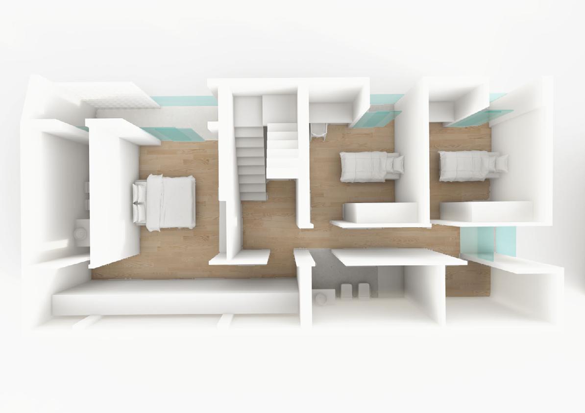 Su planta alta se divide en un baño y dos amplios dormitorios dobles con una terraza común. La otra parte corresponde a un dormitorio en suite con vestidor, baño y terraza propia.