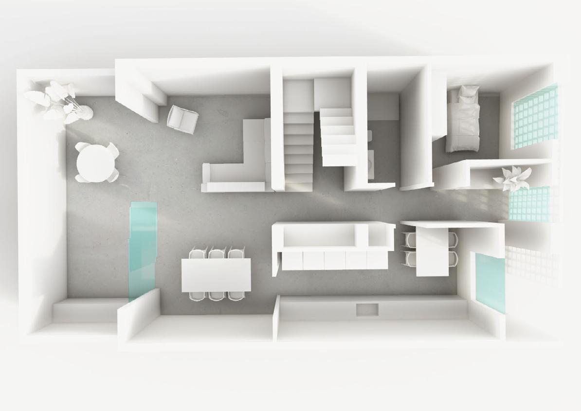 En toda la planta baja el solado se unifica buscando la continuidad a través de un porcelánico de gran formato en tonos grises. Respecto a la fachada se plantea una doble hoja formada por una celosía que otorgue privacidad y seguridad frente al tránsito exterior, y que a su vez permita la ventilación e iluminación de las estancias, así como una visión uniforme desde el exterior en toda la fachada del conjunto.