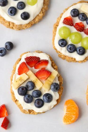 Once all the Easter eggs are formed, spread on a layer of greek yogurt Top with sliced fruit to make your designs and enjoy!
