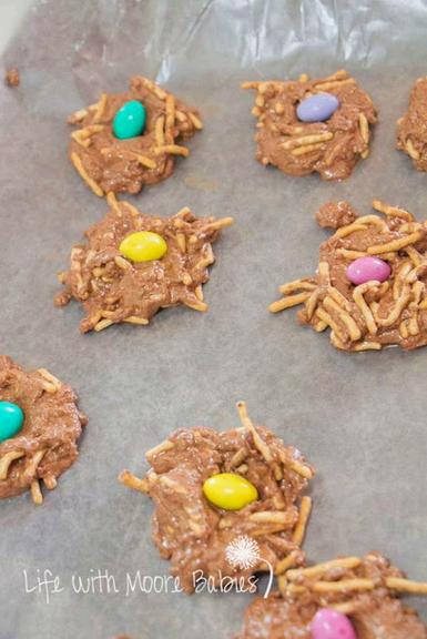 Next form little nest shapes on a waxed paper lined baking sheet. Add whatever you are using for eggs and refrigerate.