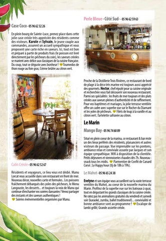 Perle Bleue - Côté Sud- - 05 96 62 59 63 Case Coco - 05 96 62 32 26 En plein bourg de Sainte-Luce, prenez place dans cette jolie case créole très appréciée des résidents comme des visiteurs. Karole et Sylvain, le jeune couple aux commandes, assurent un accueil sympathique et vous proposent une carte riche en saveurs. Ici, tout est bon et préparé à partir de produits frais (le poisson est livré directement par les pêcheurs du coin), les saveurs créoles se marient avec délice aux classiques de la cuisine française. Du coup, tout se déguste avec bonheur ! Tournedos de thon rouge au foie gras; Crème brûlée au citron vert. Proche de la Distillerie Trois Rivières, ce restaurant de bord de plage à la déco très marine est toujours aussi apprécié des gourmets. Hector, chef réputé pour sa cuisine originale et recherchée vous fait découvrir son nouveau restaurant. Parmi ses spécialités : les fruits de mer toujours et des plats créoles aux saveurs pleines d’authenticité et de raffinement. Pour vos baptêmes et mariages, la jolie terrasse ventilée offre un cadre avec superbe vue sur le Rocher du Diamant et les yoles de pêcheurs. Filets de loup à la vanille et au citron vert ; Tartelette safranée au citron.