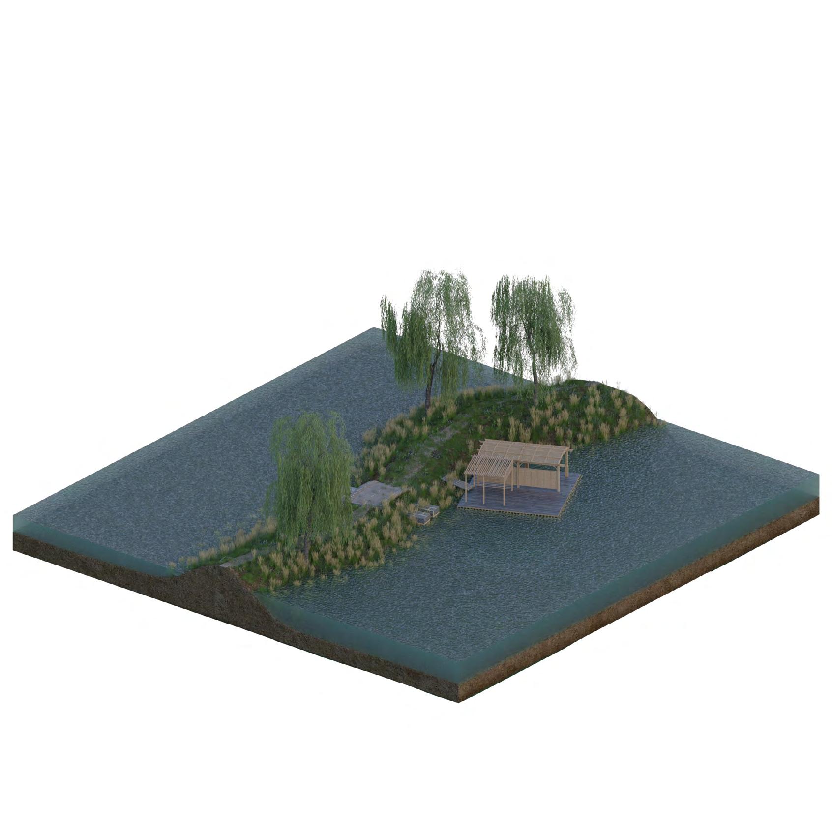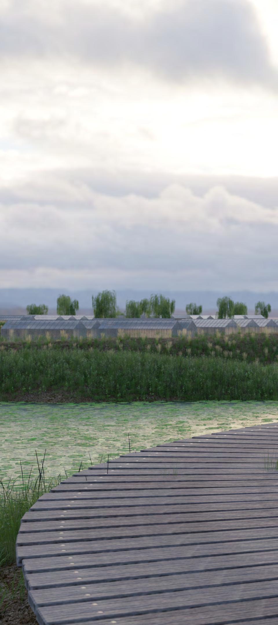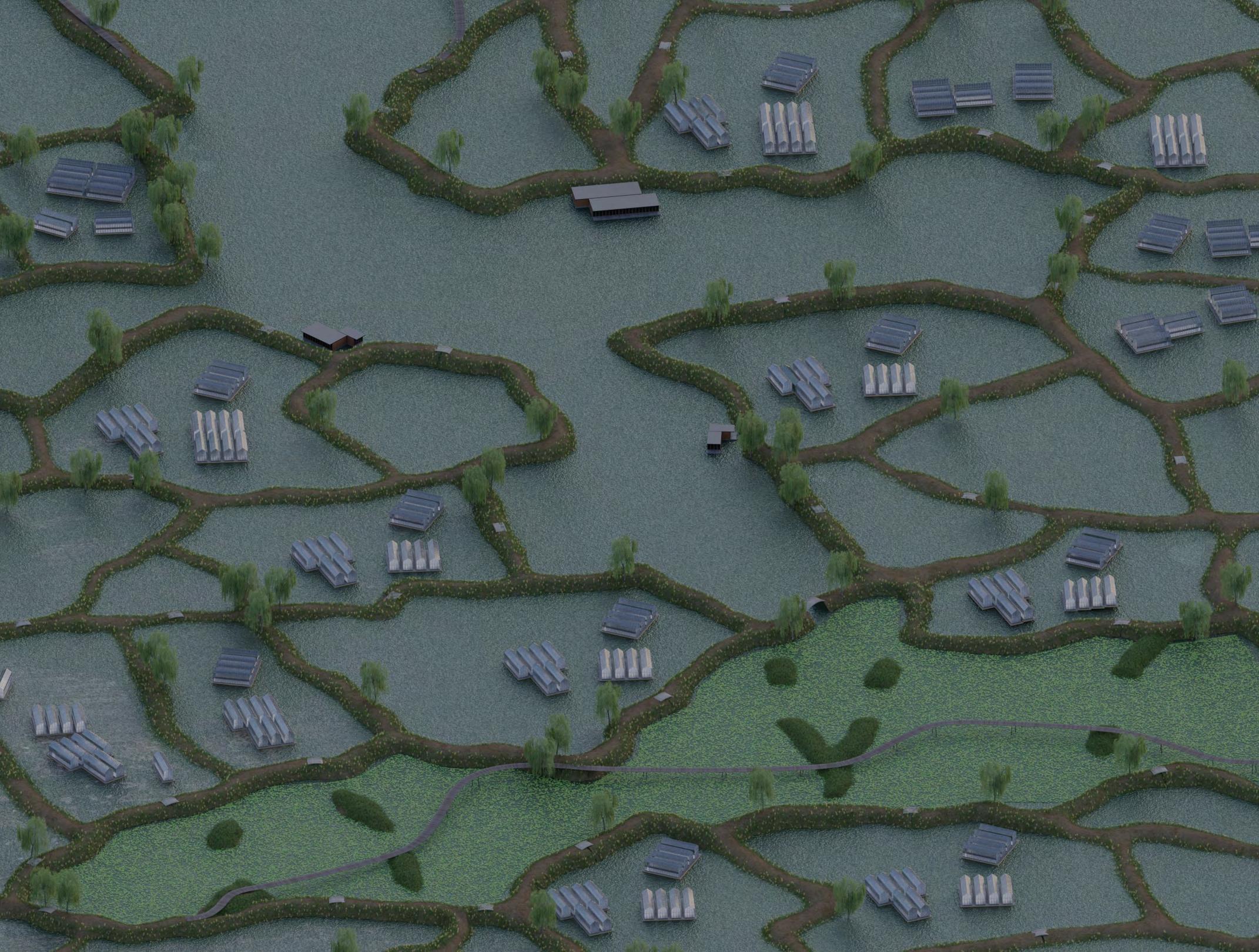 Tento projekt přijímá strategii opačnou k běžně používané metodě rekultivace půdy, která slouží k získání dalšího území. Tento alternativní proces, známý jako odpolderování, je zde uplatněn prostřednictvím inovativního krajinného návrhu inspirovaného tektonikou prasklin v bahně. Návrh je poté zaplaven vodou, čímž vzniká síť rybníků a hrází. Výsledkem je akvakulturní park, který umožňuje různé aktivity a snaží se podpořit nové estetické zážitky a vytvořit prostor pro rekreační činnosti. Díky propojení programování a infrastrukturních funkcí vznikají diverzifikované ekonomiky a jsou budovány vzájemně prospěšné vztahy mezi lidmi, rybami a rostlinami. Akvakulturní krajiny tak mají významný kulturní a ekologický přínos.