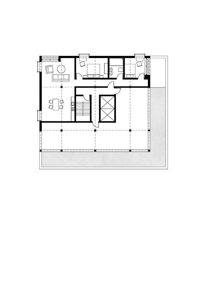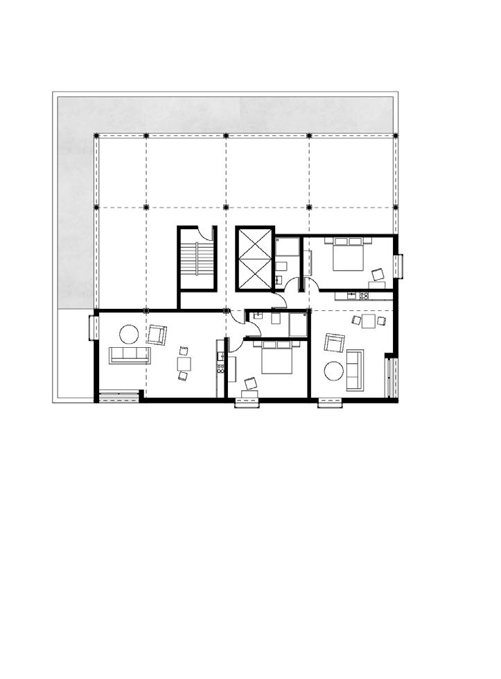 Each apartment has its living room at the corner, the most prominent location - and each corner has an indented window at one side. Furthermore, each room has at least one extruded window. This rule ensures that each room is properly lit, and in the same time it creates the distinctive pattern of the facade of the tower.