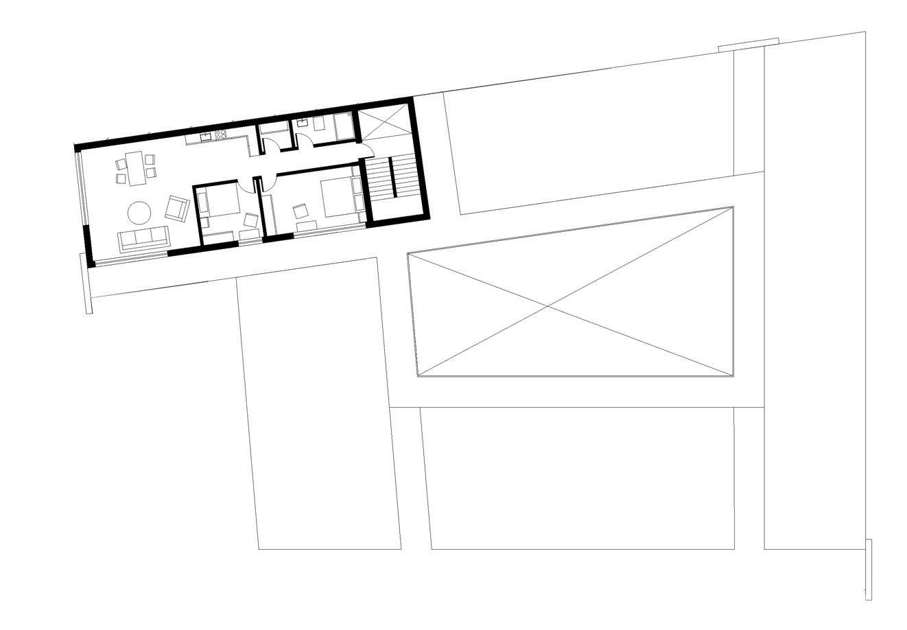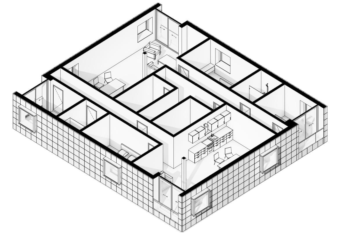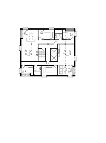 The dementia care home follows a radial organization - each unit is centered around a communal courtyard. The ground and first floor house all residents of the facility, as well as the shared spaces, while the second floor serves as the home of the care couple responsible for the home.