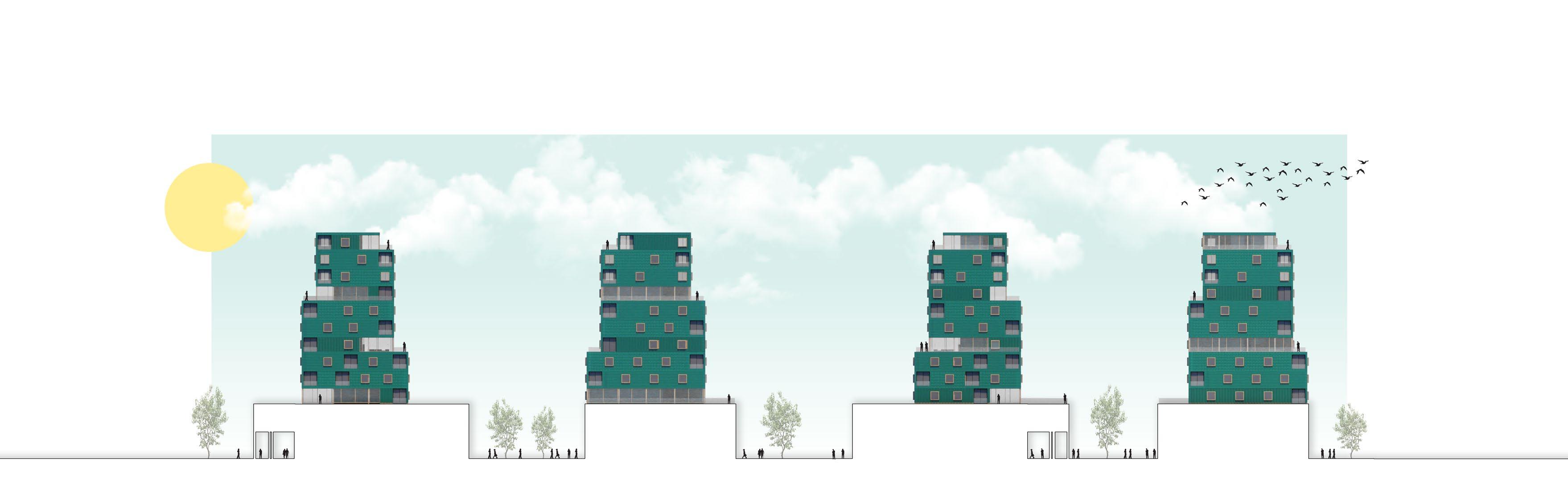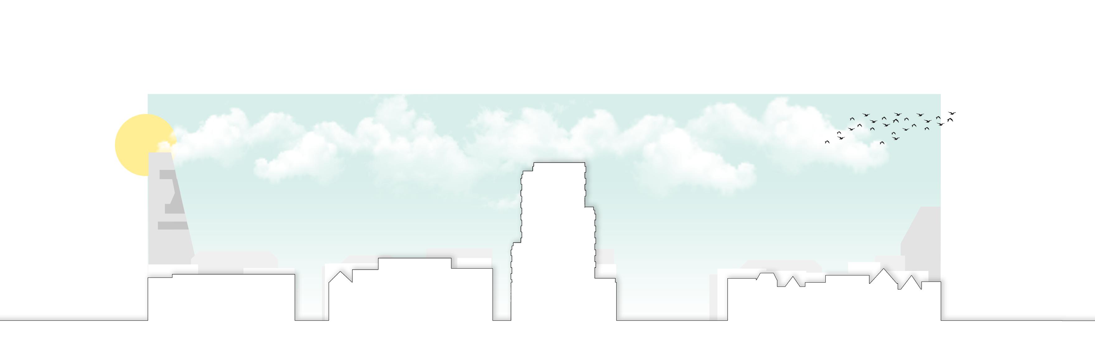 Opposite the dementia care home and on top of the C&A building, sits the tower of the people. It rises 10 stories above the C&A building, and each third floor two of its facades shift inward, creating large shared balconies for its residents.