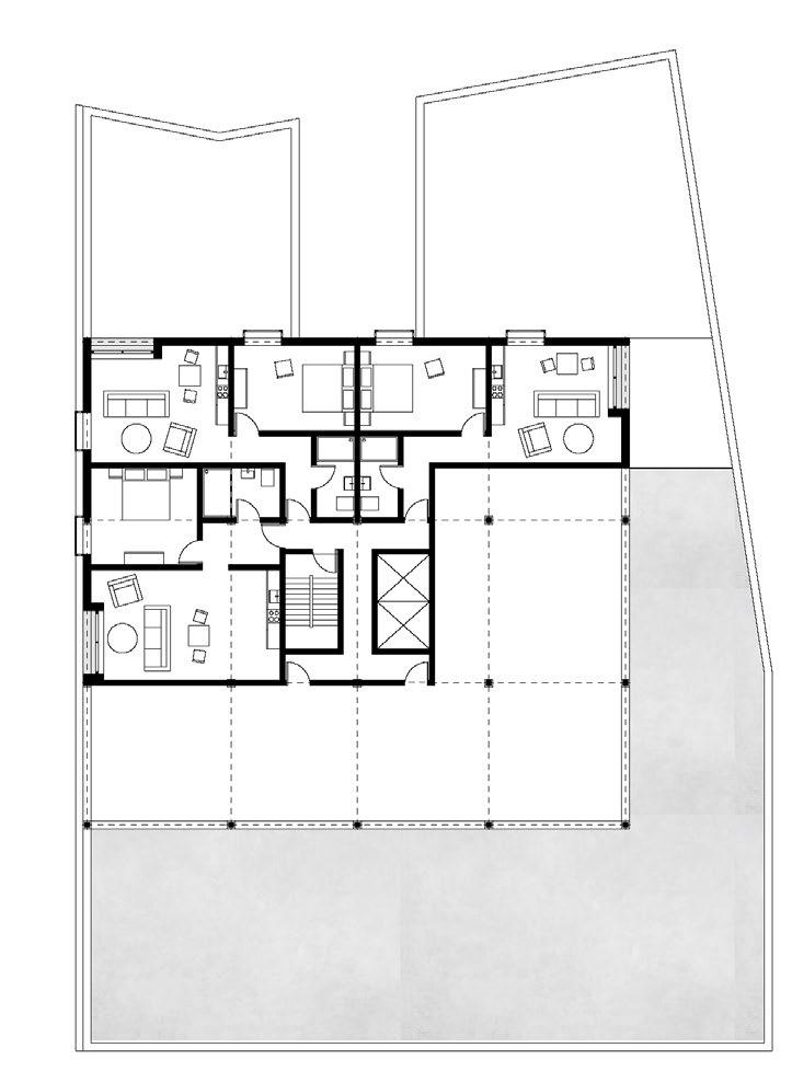 At each setback floor, half of the apartments are replaced by a shared living room - a communal space meant for residents to gather, relax, work, study, but most importantly - to connect to the city of Groningen visually.