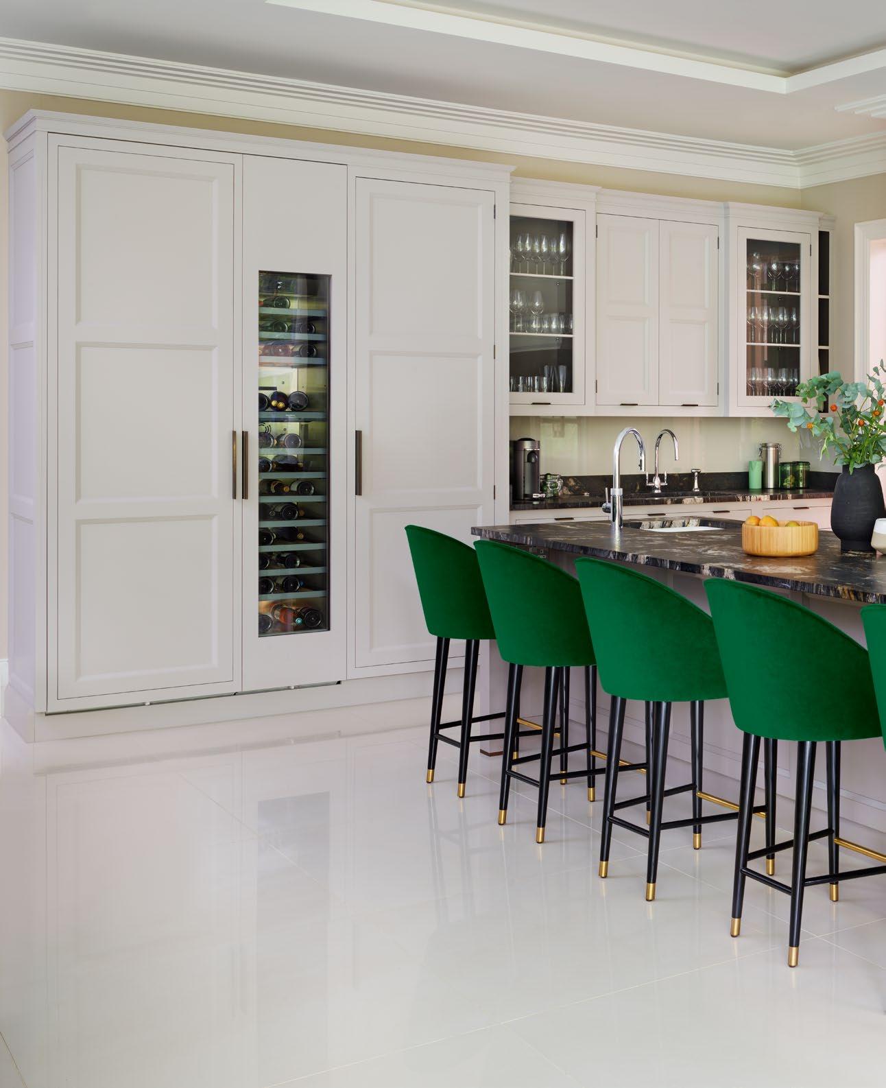 The brief was to create a truly custom-made, statement kitchen and our New Deco collection was the perfect starting point. Beautiful, luxurious materials feature throughout the design; doors are inlaid with pale leathered faux snakeskin or dark marble effect porcelain panels set off with satin brass inlays. The drinks cabinets are embellished with metallic interiors, backed with antique mirror and placed on powder-coated black legs. It was key that the Martin Moore designer was involved from the very start of this prestigious project. The long rectangular room with raised entrance has a grand island that spans the width of the room to create not only a practical, zoned space but a highly social kitchen. Family and friends naturally gather at the breakfast bar sited close to the appliance cupboard, with its coffee machine and the adjacent drinks cabinet, while larger groups dine at the central table.