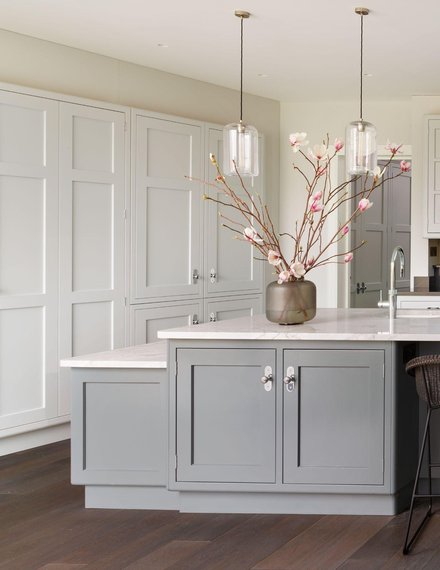 Originally, pink was suggested for the colour scheme, however, after much discussion the designer and owners opted for a neutral shade of cream with a hint of blush pink, giving the kitchen a more timeless, classic feel. Materials and finishes play an important role in the design; in total contrast to the grey quartz used on the kitchen island, dark granite was chosen for the cooking run. Brass knobs and handles add visual interest.