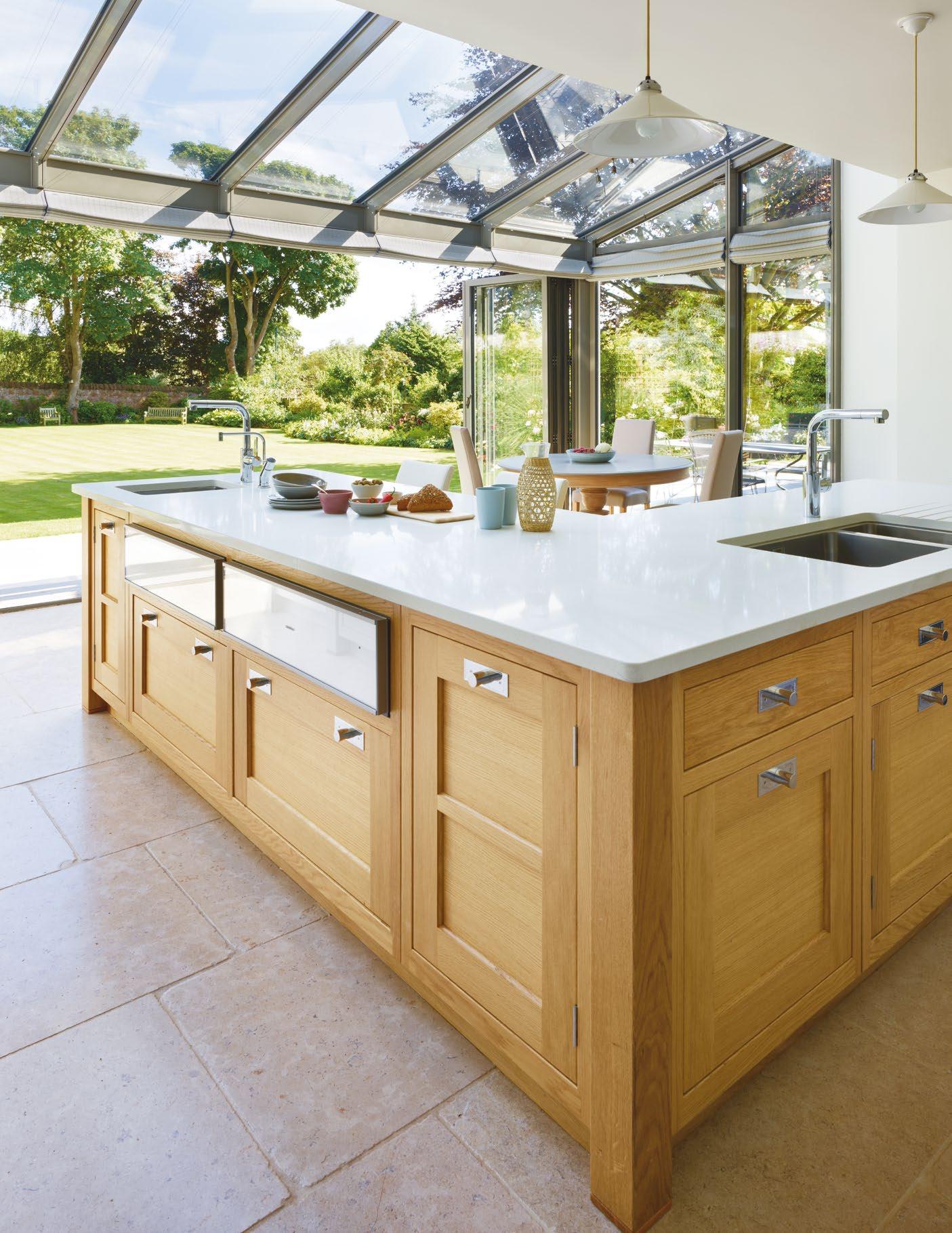 Having fallen in love with a kitchen seen in Martin Moore’s brochure, the owners approached us to recreate the look for their new kitchen/dining/living space. Spatially, the layout was heavily influenced by the style and placement of the large sash windows which feature throughout the room. Clever planning was crucial; with only one full length wall to accommodate all the essential elements of the kitchen more emphasis was placed on the island to have a double sink, dishwasher and undercounter freezer drawers at either end.