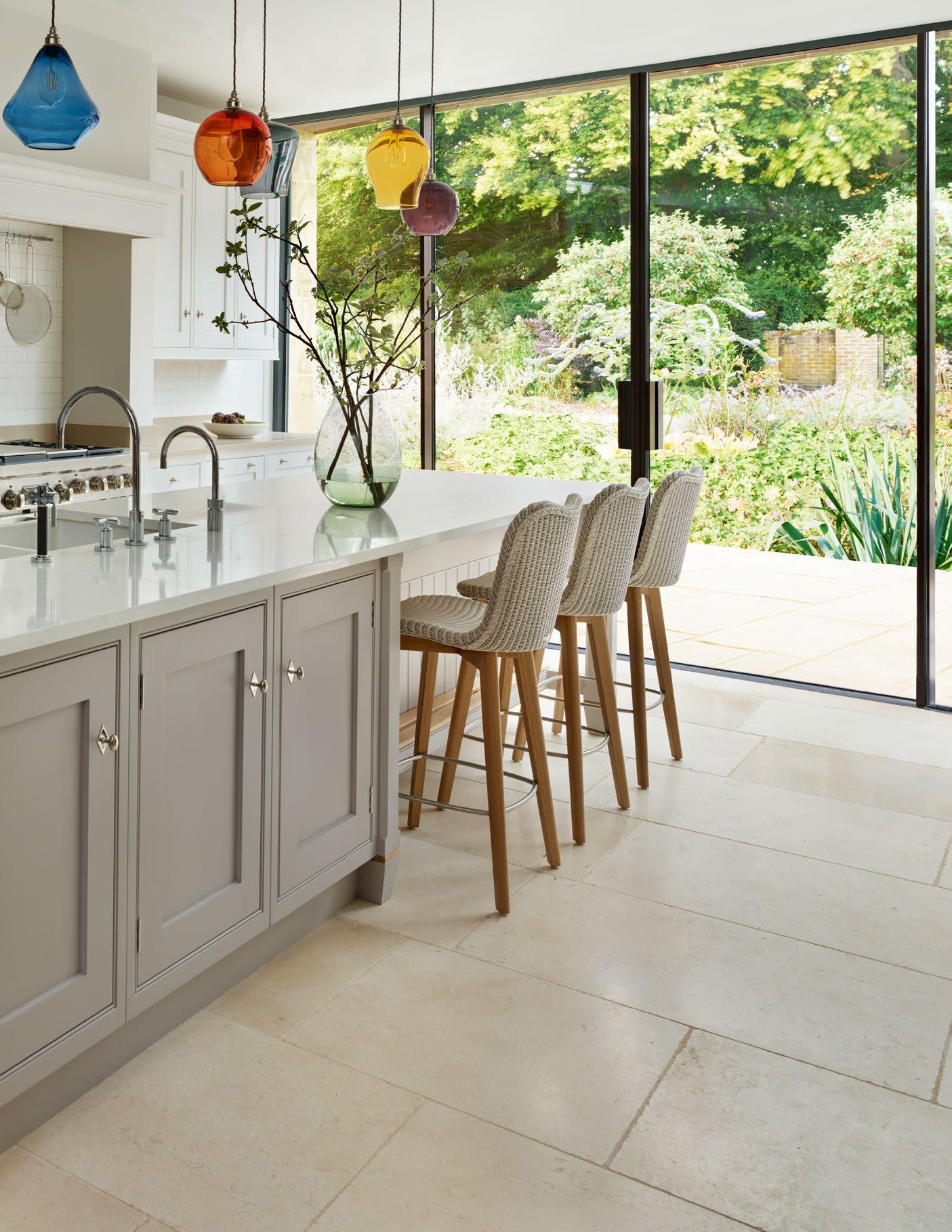 By adding an extension to their Arts and Crafts home our clients created a bright and airy family kitchen. With glass on three sides the design challenge was to accommodate enough storage, without wall cabinets, to preserve the open-plan space and sightlines to the garden and rolling countryside beyond.