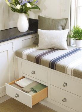 Nearing completion of their new house, these clients, an architect and her graphic designer partner, had not resolved a ‘modern versus classic’ kitchen debate until they saw our English Kitchen. Inspired by the work of the neoclassical architect Inigo Jones, it has the correct proportions of English period furniture but lends itself happily to contemporary detailing. And therein lay the solution for this project. Classic cabinetry is enhanced by modern decorative elements, from stainless steel appliances, metro tiles and ribbed glass to the specially-commissioned glass pendant lights. The informal eating and sitting space, with its oak-lined back wall, features lush, velvetupholstered banquettes surrounding a stylish glass and oak table. As with everything in this kitchen, it’s a chic fusion of two very personal styles.