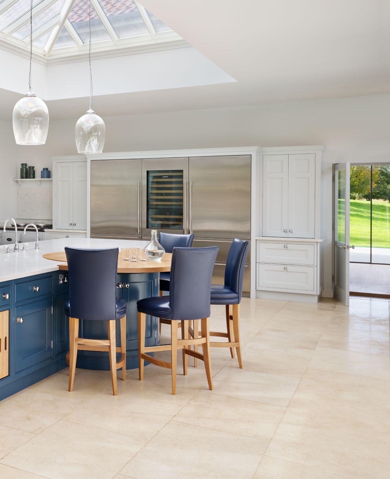 With a more relaxed feel than the formal dining area adjacent to the kitchen, the ‘island table’ acts as an intermediate dining space where the family can gather. Sitting opposite each other is a highly social layout and allows traffic flow through the kitchen without disturbing the cook. The colour scheme of the kitchen is predominantly soft and neutral with small pops of colour. Taking their inspiration from Martin Moore’s New Deco display in the Altrincham showroom, the homeowners chose a soft turquoise colour for the bar stools.