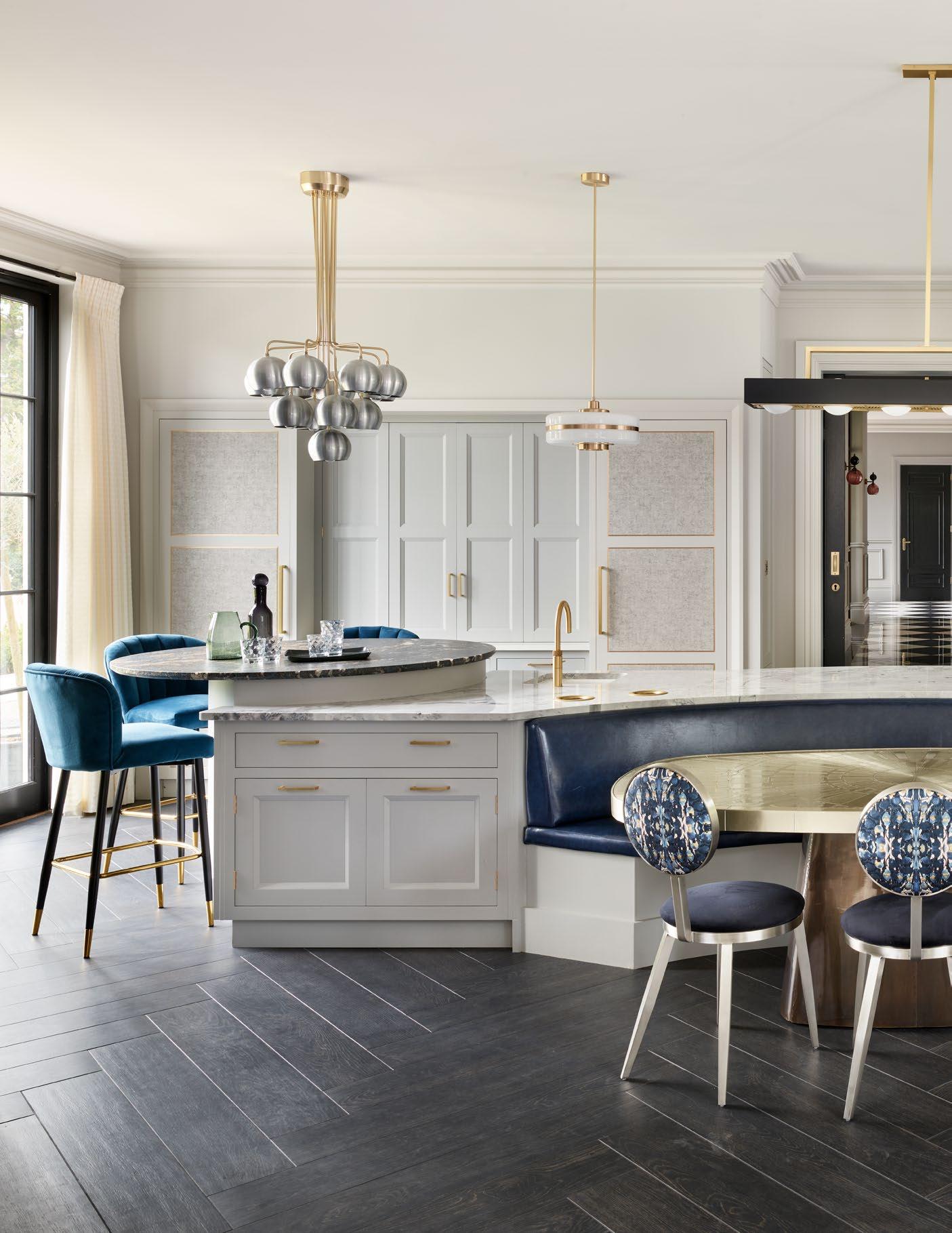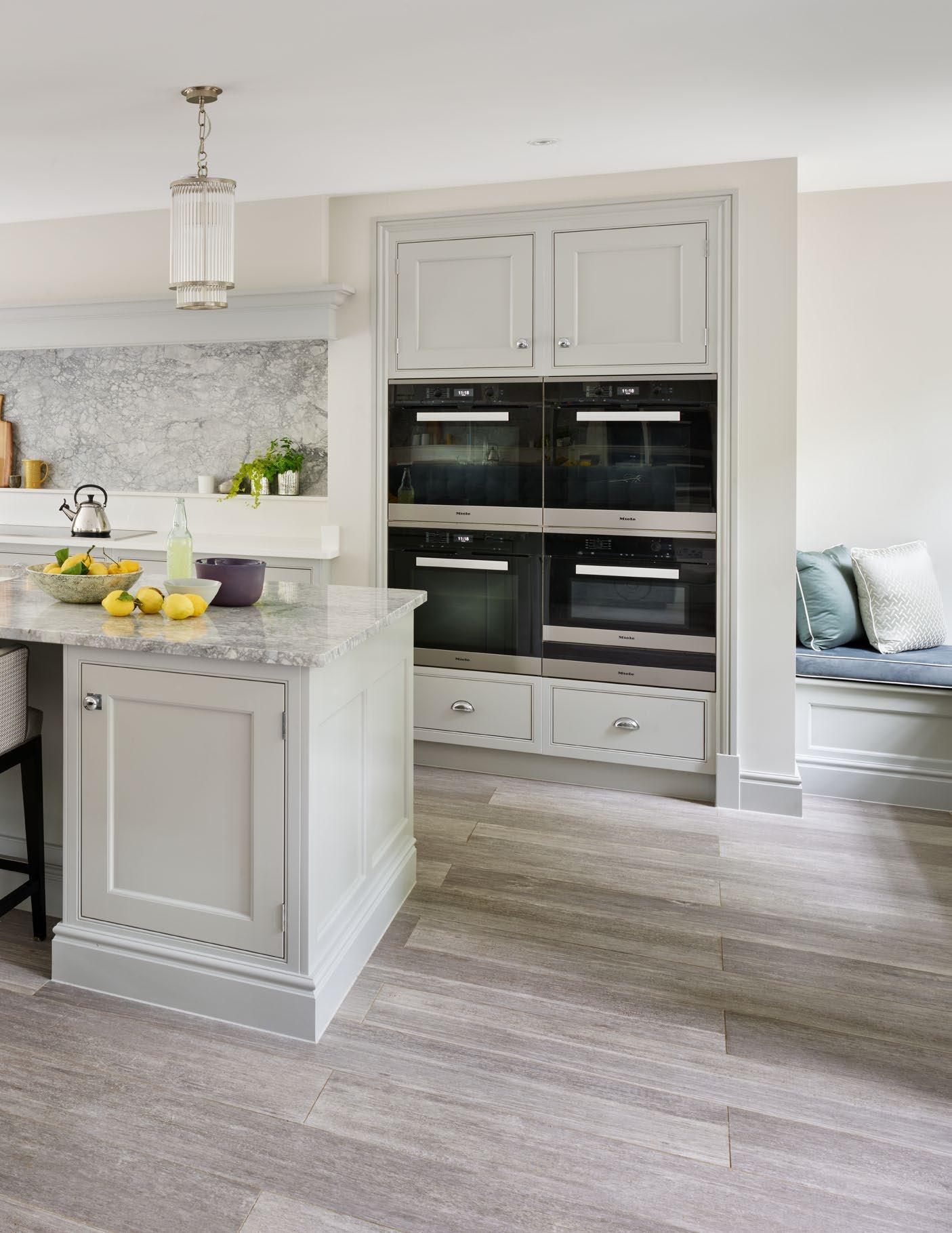 The new colour scheme features light, dreamy neutrals; Martin Moore’s New Classic cabinetry painted in ‘Chalky Grey’, is paired with striking marble-effect quartz, used for the island worktop and large splashback. Brushed brass knobs bring contrast and warmth to the kitchen, whilst ribbed glass door panels and pale blue cupboard interiors provide decorative interest and a visual link with the dining chairs and banquette upholstery. The waterfall edge of the island worktop marks the division point between the kitchen and dining area.