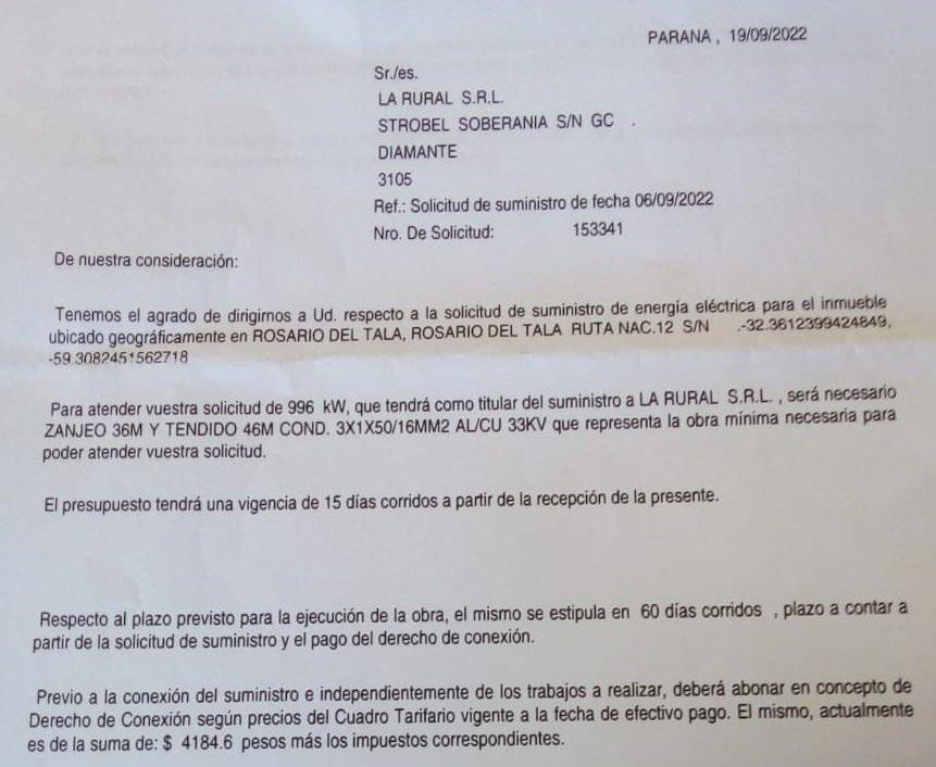 • 19 de septiembre de 2022 (5 meses y medio de iniciado el trámite): ENERSA contesta la solicitud con los requisitos técnicos, obras necesarias y documentación a presentar. El presupuesto tenía una vigencia de 15 días y el plazo de obra se estipula en “60 días corridos, plazo a contar a partir de la solicitud del suministro y el pago del Derecho de Conexión ($4.184,60)”. En este momento comienza el calvario técnico.