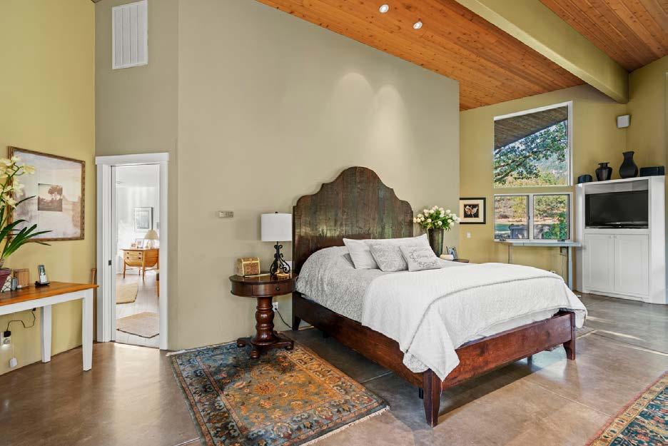 The master suite is reached by a window-lined hallway across a courtyard, a design element that draws the outdoors into daily living. Inside, vaulted ceilings and a stone fireplace create warmth, while two large covered patios provide private creekside views. Dual baths offer separate retreats—his with a steam shower, sauna, and walk-in closet; hers with a soaking tub, custom jewelry cabinetry, walk-in closet, and generous counters. A dedicated laundry with access to the hot tub completes the suite. The guest wing includes two ensuite bedrooms, a private jacuzzi room, and its own laundry, while the loft level includes a full bath for additional flexibility.