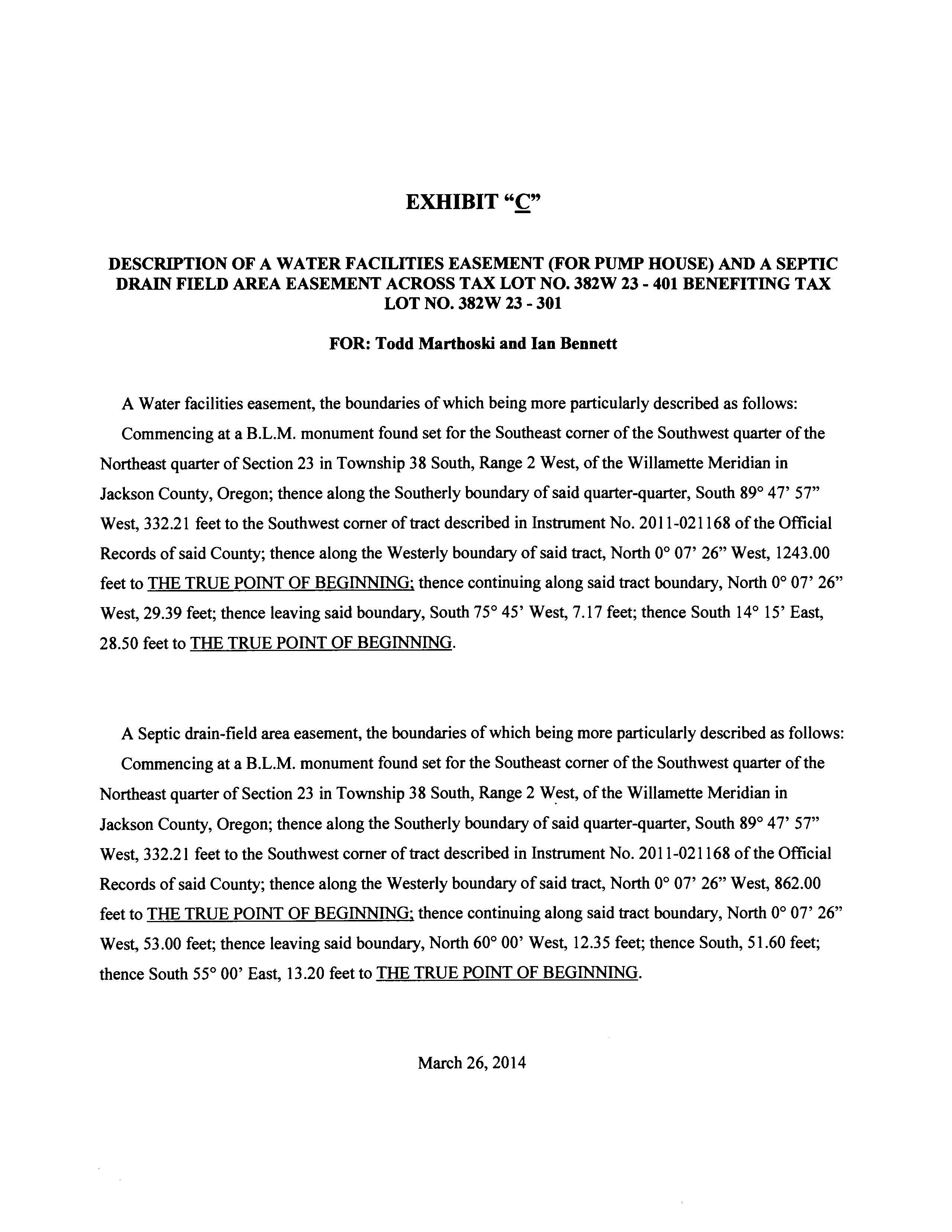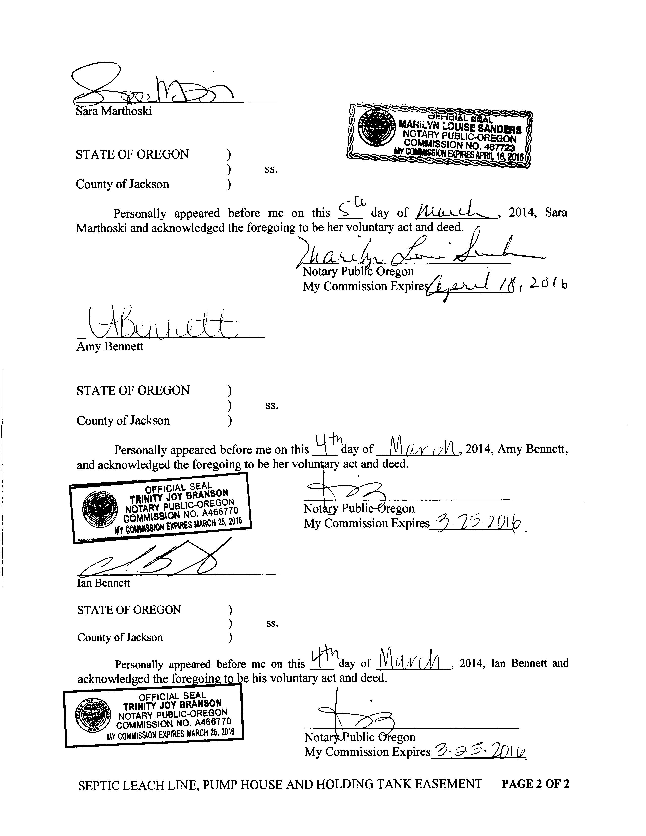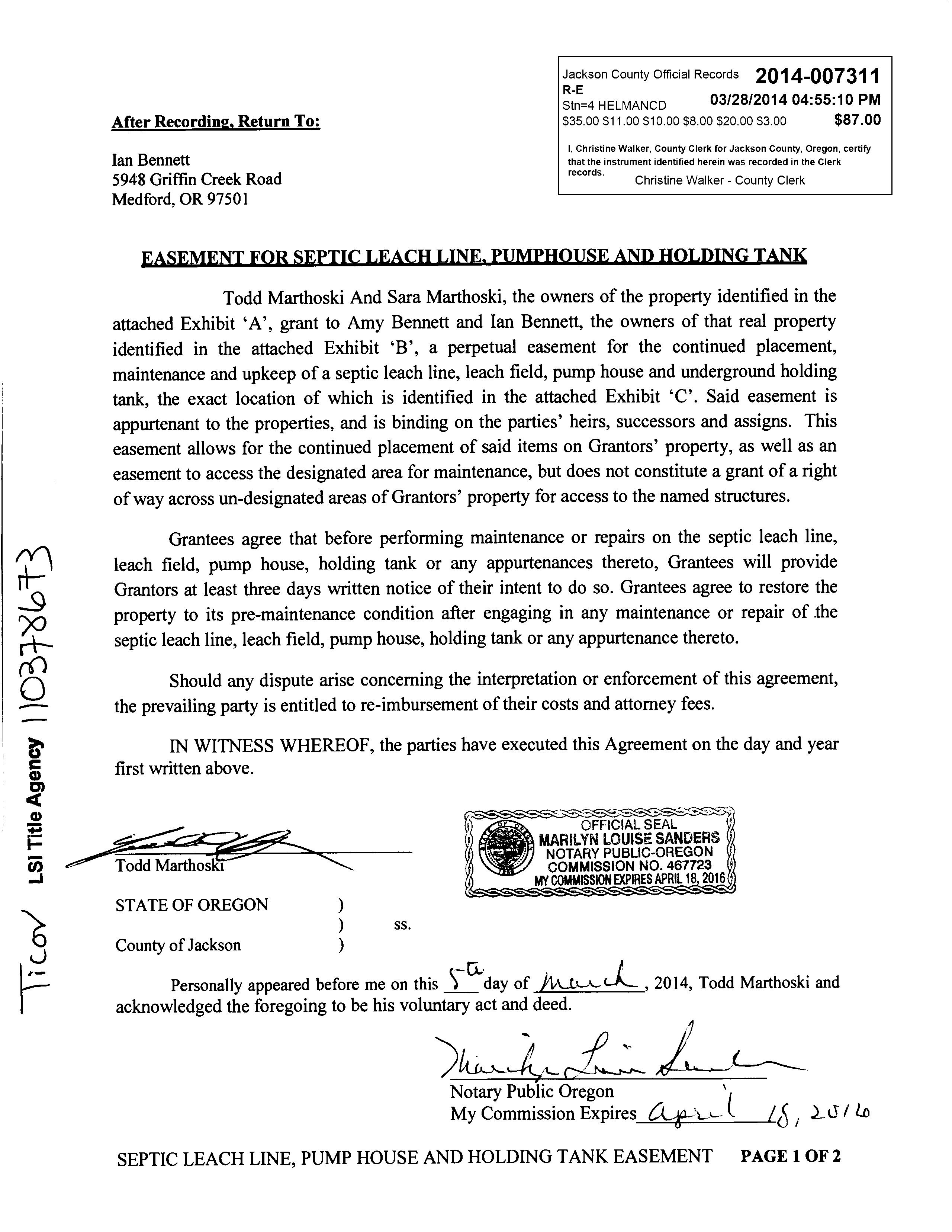 Recording Information: March 28, 2014 as Document No. 2014-007311 For: septic leach line, pumphouse and holding tank