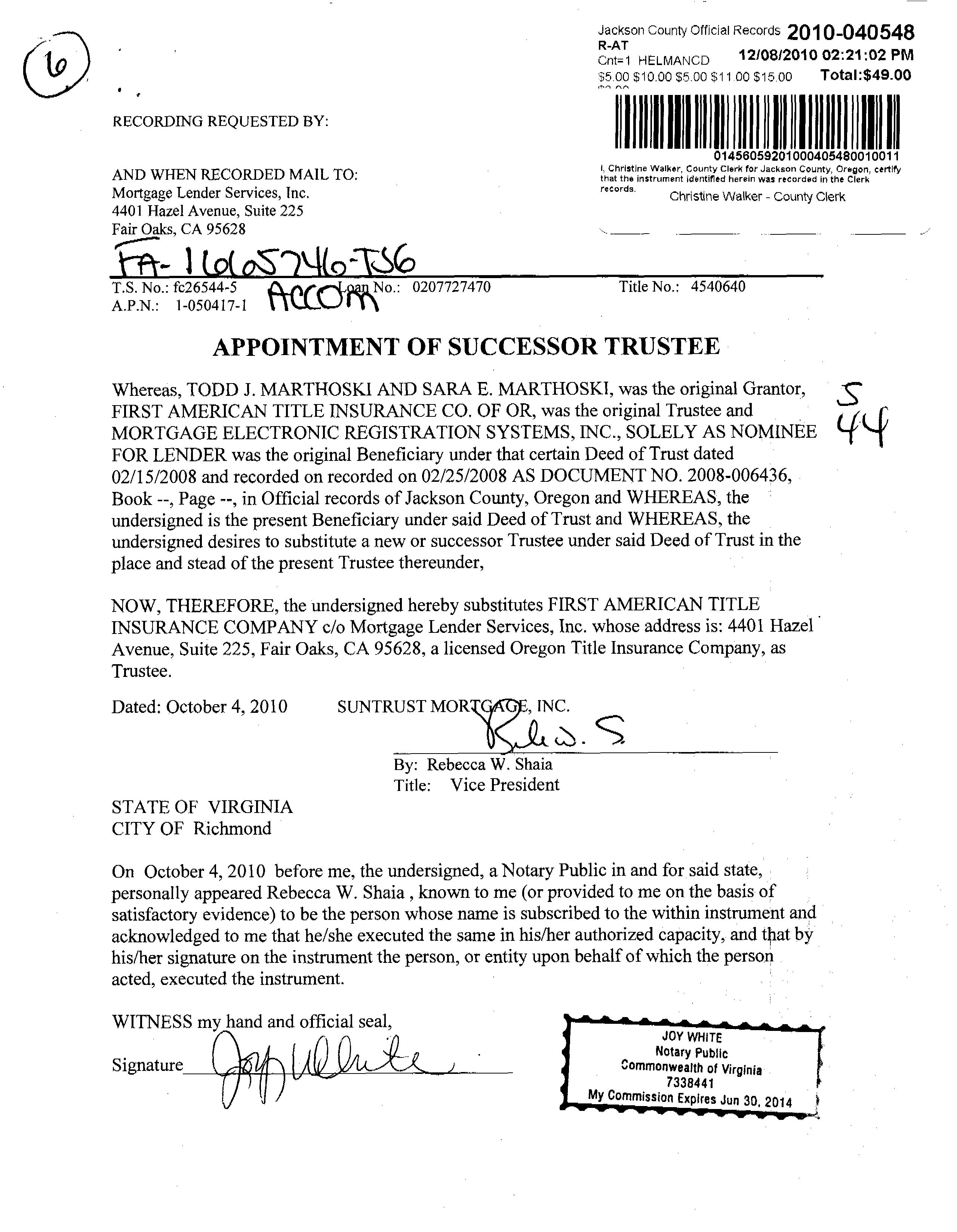 A document recorded December 08, 2010 as Document No. 2010-040548 of Official Records provides that First American Title Insurance Company was substituted as trustee under the deed of trust.