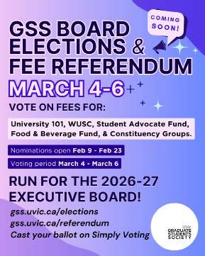 At the Dec. 5, 2025, Senate meeting, a member of UVic administration said that updating the language of awards would be a slow and ongoing process, requiring working with the Development Ofce and donors to apply more inclusive language.
