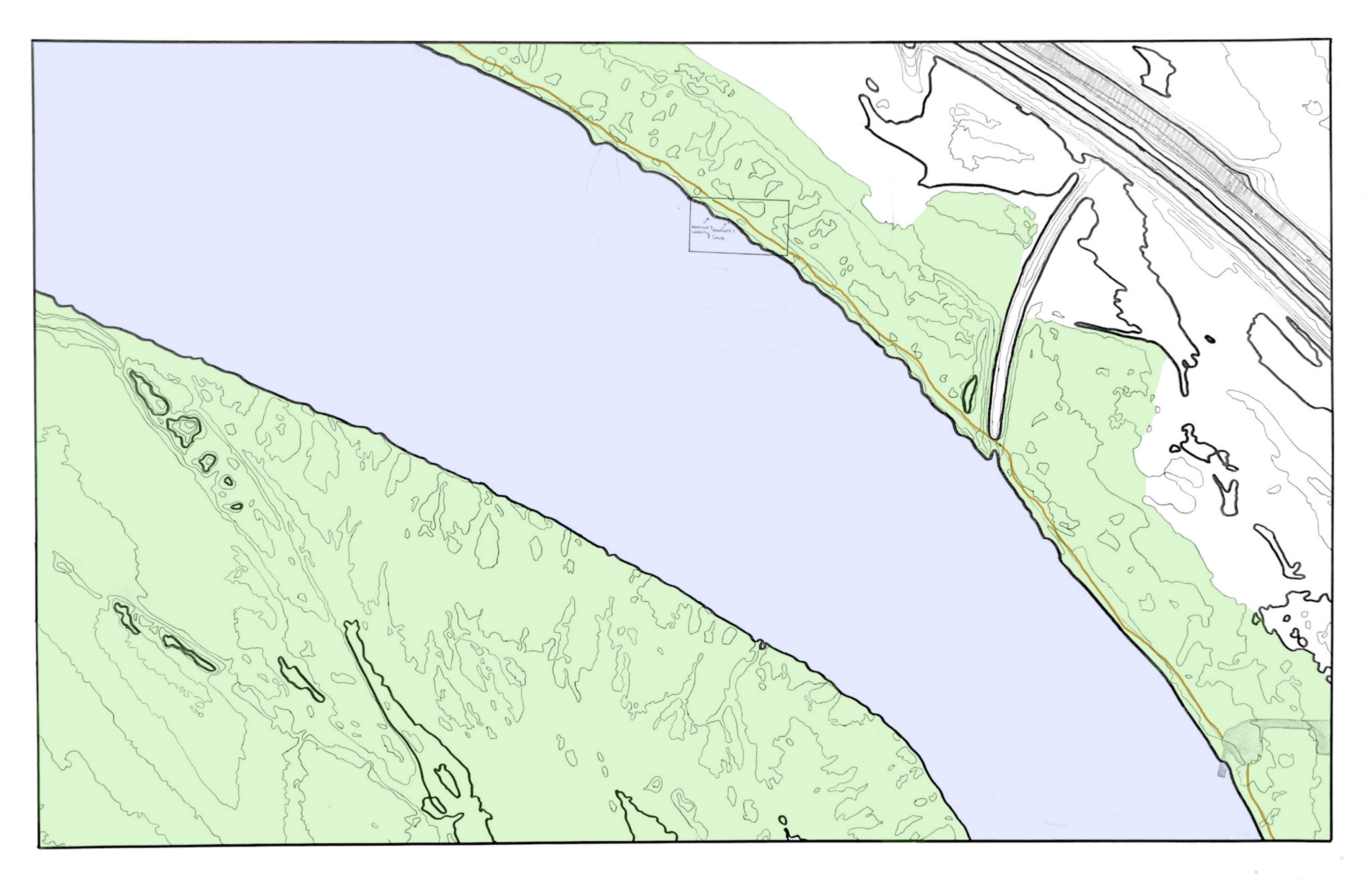 As you walk along the site path, you notice trees run along the river about ten feet above where the water meets the land. And just parallel to the trees, you begin to see ‘ microcoves .’ as shown in the site map, they are small indents in the land creating open, inviting semispherical spaces. This is shown in moment 1. What was just to the right of this moment made this site location particularly valueable: a natural landing that allowed one to see the river at its full (Moment 2).