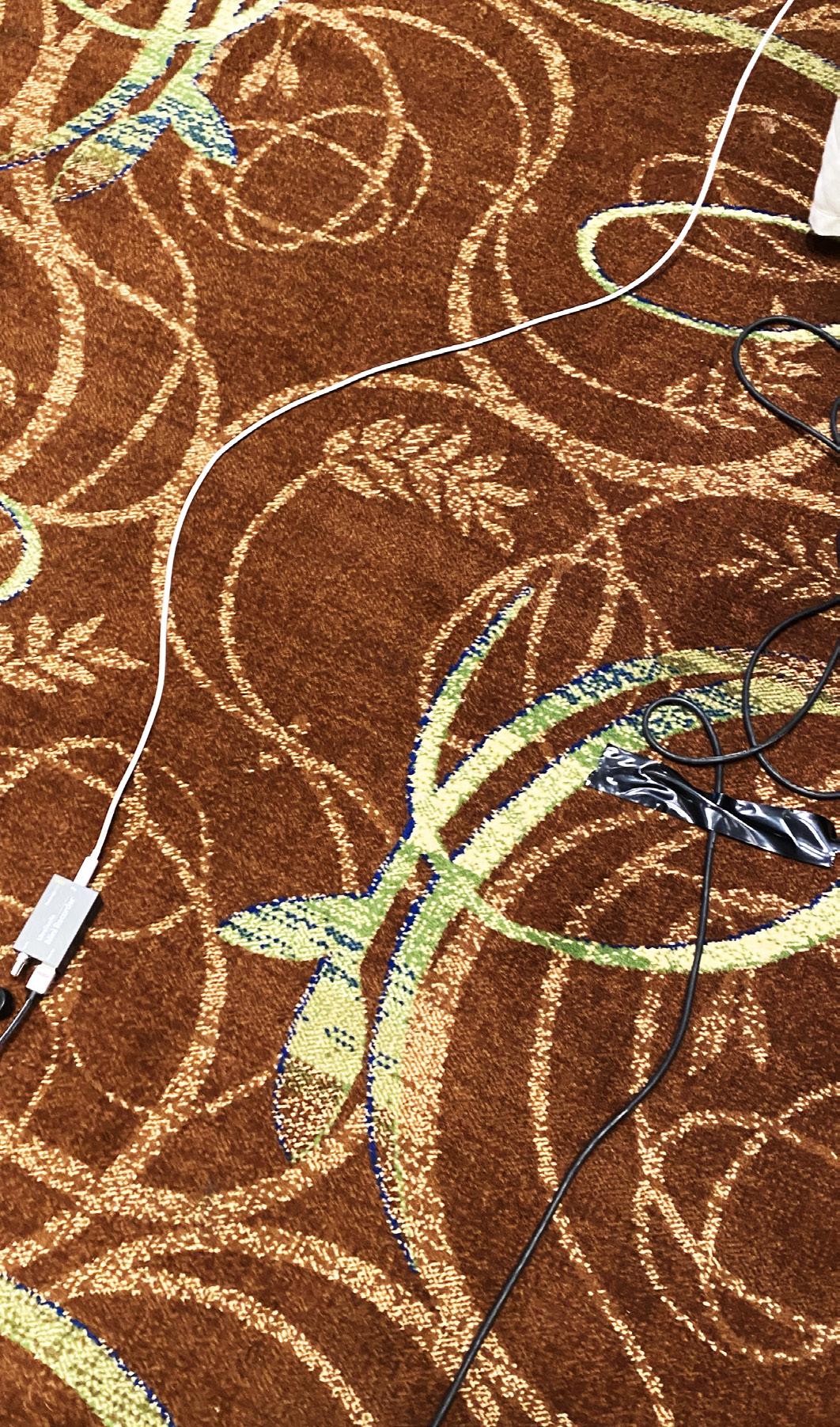 this ecstatic form of Christianity had shown itself capable of uniting believers across racial and ethnic divisions, and one hundred years later it was the fastest growing version of Christianity around the world. One reason for this global success was on display here: it made no demands for a dedicated church building or sacred space. Everything important could be experienced right here and now. It’s a faith that doesn’t demand citizenship, but adapts to permanent outsider status. At the bottom right of the previous image is a laptop screen. The service was being broadcast live via a link on Facebook, and so theoretically it could be viewed around the world. I looked down at the twining floral ballroom carpet, and I noticed how the