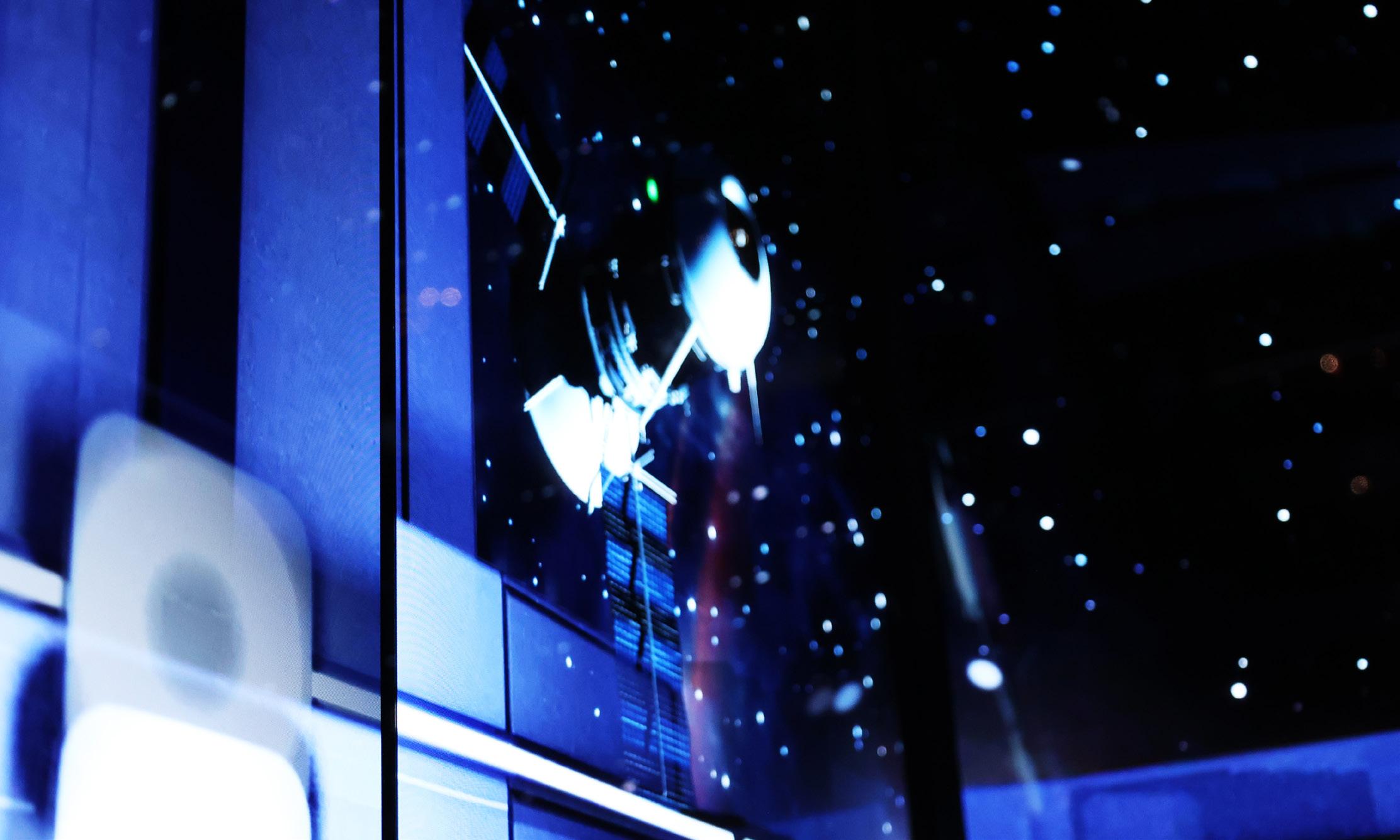 observation deck we left behind the screen view of the cityscape. The clouds on the walls and ceiling thin and suddenly we were in space, and a satellite was projected above us. Perhaps the speed of the elevator suggested to designers the idea of a rocket, and the obvious destination then becomes space. As designers thought more about this, they realized that the Burj Khalifa was a kind of down payment for even loftier goals. There’s a science fiction feel to Dubai now, and a space extension to this real estate dream could bring the Sheikh closer to the realm occupied by his great exemplars like Jeff Bezos and Elon Musk. This tower isn’t the end of city-building, but a stepping stone. As the elevator doors opened onto the observation deck, we