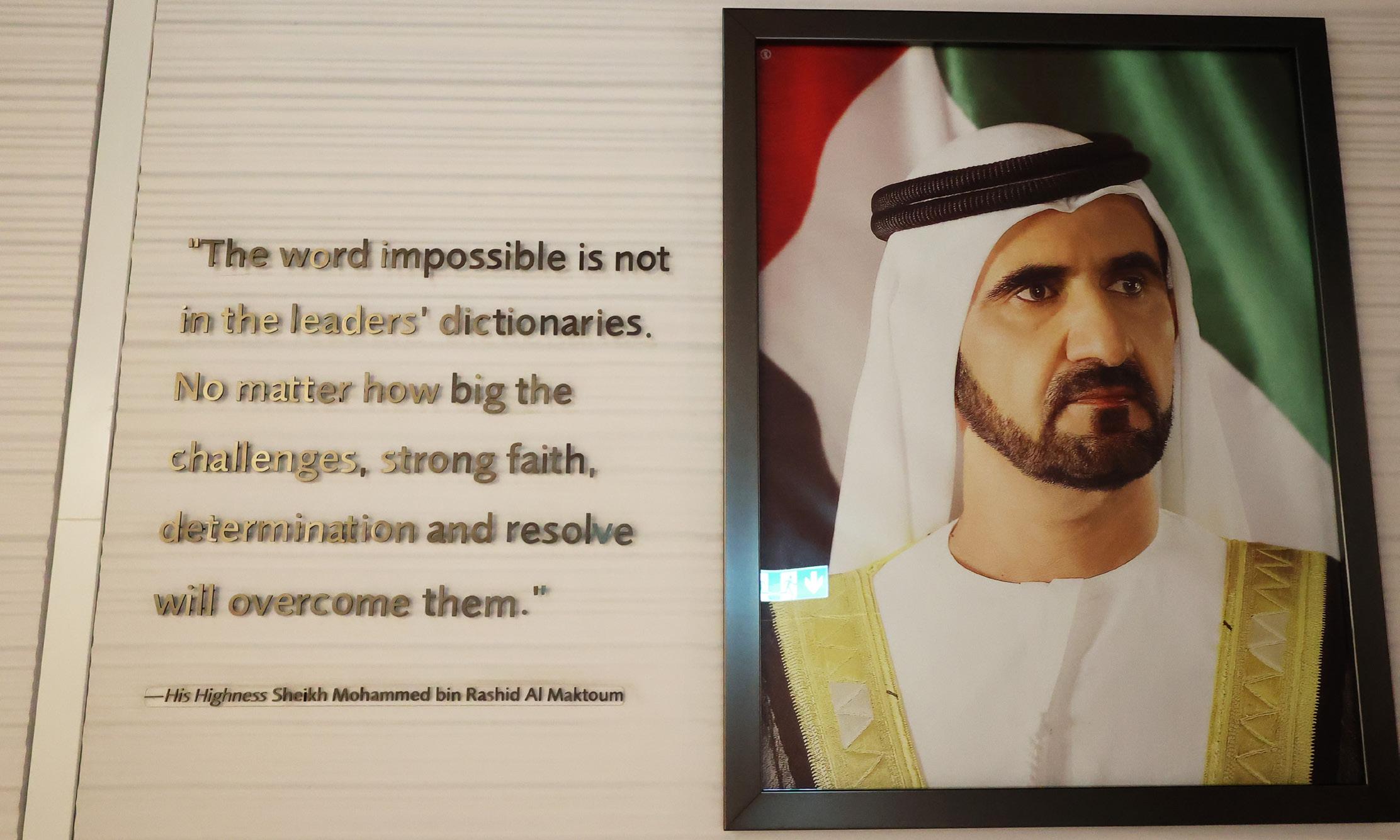 around Dubai. He is not present in the same way as royalty in other Arabic speaking countries, such as Mohamed VI in Morocco or Abdullah II in Jordan. Those leaders are present everywhere in their respective countries as reminders of power. There’s something of that same power in these images of Sheikh Mohammed, but these images also came with a short sermon about innovation. At times they are a bromide, like here: “The word impossible is not in the leaders’ dictionaries.” Given the placement of these words, the Burj Khalifa is transformed into a symbol for the overcoming of challenges by faith and resolve on the part of a great leader. Legitimacy is created in the UAE not by democratic approval, but by the Sheikh’s similarity to a tech CEO. It