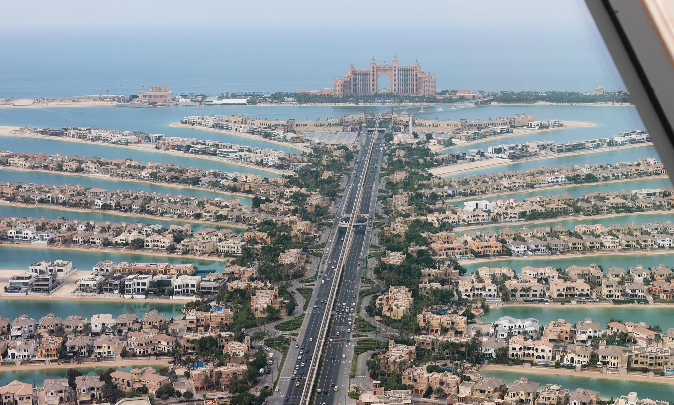 Earth. More than any aesthetic quality the palm tree represented the best possible design for multiplying beachfront property. Its elegance served to hide the fact that this was the work of a cynical world creator who wanted nothing but to multiply lots with beach access. The Palm’s fronds are lined with pricey villas, and this is a popular area for celebrities like football star David Beckham and fashion designer Giorgio Armani. Those are celebrities with faces, but the most important class of owners here are the faceless global elite, who find in Dubai a stable and luxurious escape. They know that their privacy will be defended above any conception of the public good. Standing at The View we located Dukes, our hotel for some nights. The structure in