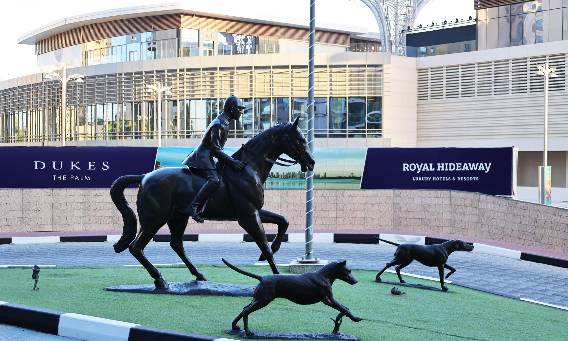 of luxury (which we couldn’t touch), but it brought a limited view of the luxury life. Dukes: The Palm had opened in 2017. It was patterned after a luxury hotel of the same name in London’s Mayfair (near Hyde Park and Buckingham Palace). On the driveway up to the hotel entrance we saw this statue group of a foxhunter with dogs. Foxhunting is a controversial part of English culture, so much so that is was actually banned in 2005! But banned or not this “sport” retained its value as an instant symbol for a certain lifestyle. The hotel featured a British-themed restaurant and pub (of course), along with other touches of obvious Englishness. To the side of this entrance was also a sign encouraging visitors to use the hashtag “royal hideaway.” The implication