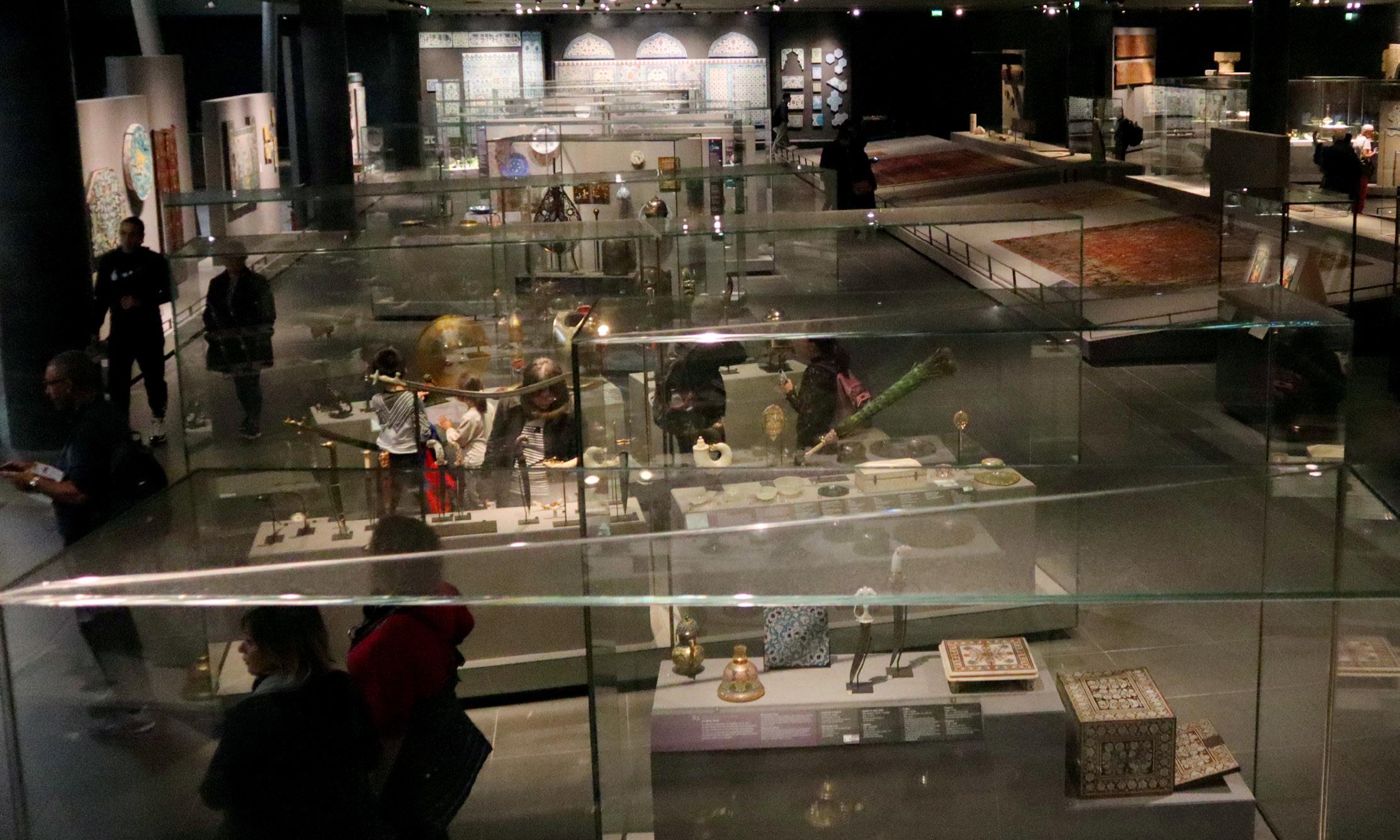 works of art. (Family plans limited my time.) Before I left I took this photo of the room I was passing up. It’s possible at the back to see deep blue samples of Iznik tiling from the Ottomans, and large Persian rugs on display on the right. After visiting the Abu Dhabi Louvre, I came to believe that this overflow of objects would have a greater impact if spread between a series of small global museums, where single objects would be magnified and the creativity of a curator could bring out deep connections. The point in this room was quantity and coverage, and visitors could leave feeling confident they’d surveyed some of the best art from the lands of Islam. The danger was that none of this would truly stick in the mind after moving on to another section,