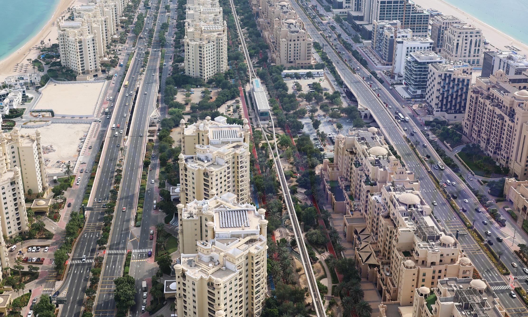 reason I had long imagined it would be fun to take a long walk on the Palm. The experience of being here convinced me otherwise. This is a view of the trunk of the Palm, heading toward the mainland. There’s nothing scenic because the trunk just feels like one big highway. From the ground the beach is invisible behind unending screens of luxury residential developments. The special Palm monorail line runs right down the middle (see that station ahead). Beside the monorail are two red-colored paths for walking or running, but even these paths dead end at the Nakheel Mall. It’s impossible to walk along those main roads or the beach, or to explore on foot any of the Palm’s fronds lined with private villas. There was no mystery about how to consume
