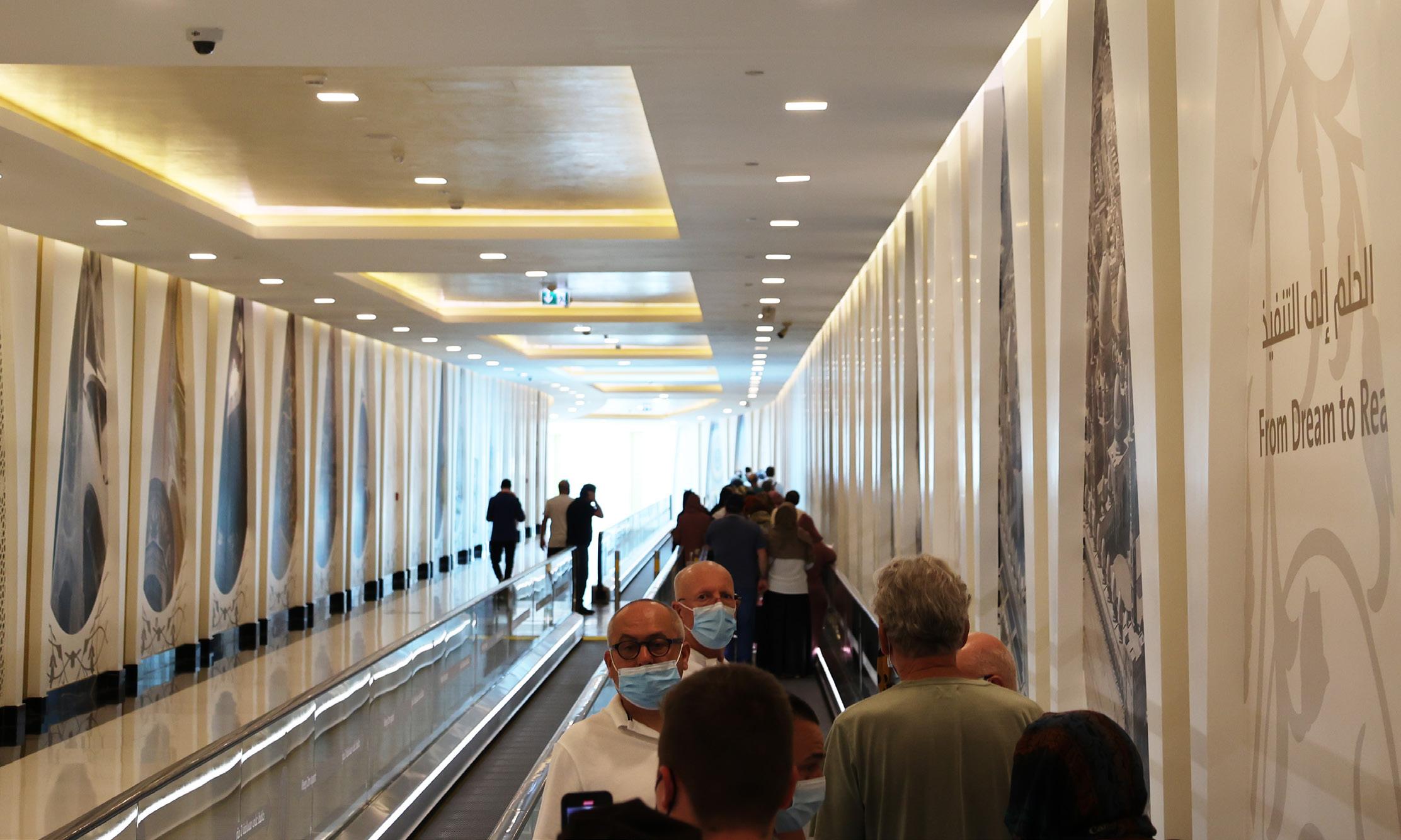 parking lot opened onto a mall with a Starbucks, Bath & Body Works, and various fast food options. This was all underground (but with skylights above), so it was as separate from the mosque experience as the underground parking. But it was still jarring to come to a mosque and find ourselves within yet another mall. The design vocabulary here was easy—100% global mall. Arabic was more prevalent in signage than had been the case in Dubai, but there was no real need for language. We were among familiar brands and images of frozen yogurt. We didn’t yet feel like browsing the souvenir shops, so we kept moving toward the grand mosque. From the mall we headed down a lengthy corridor, made easier by a moving walkway of the type we