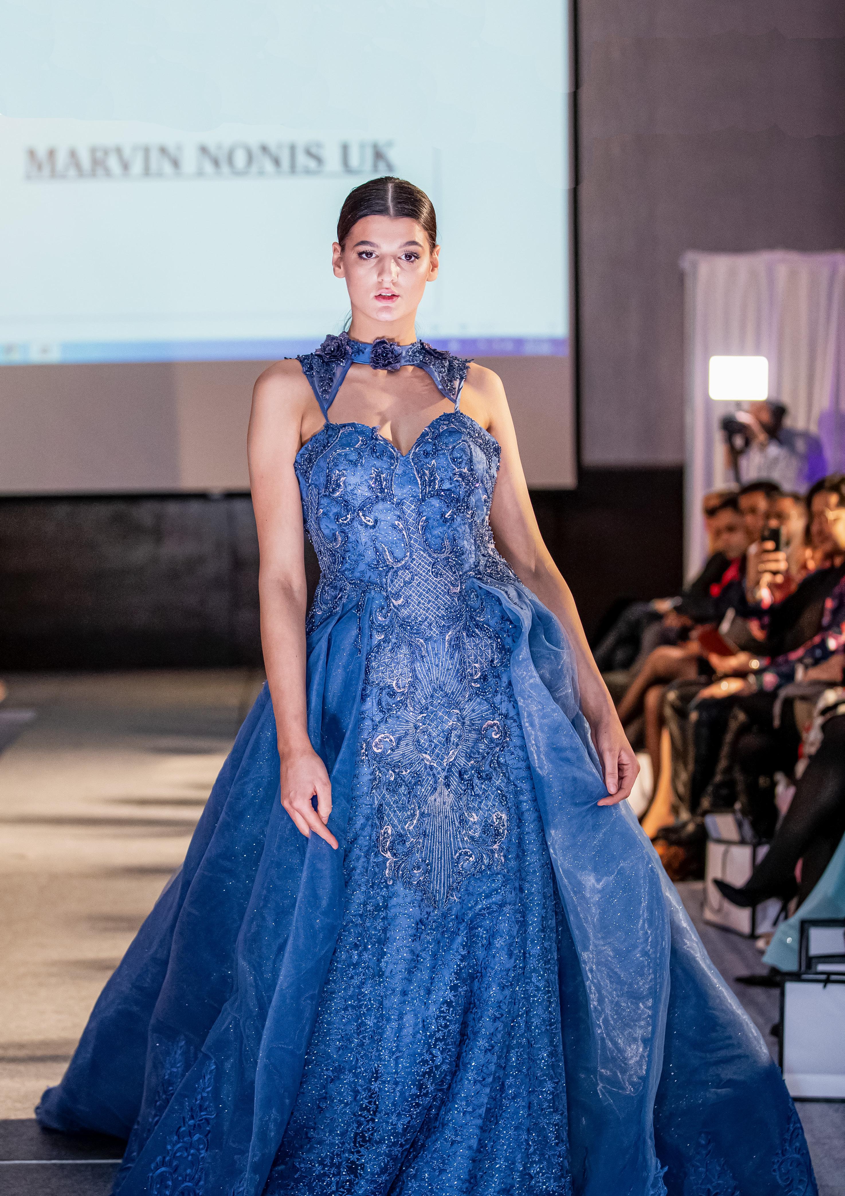 At Marvin Nonis Luxury Fashion, we believe that every garment should be a work of art. That's why our multi-award winning designer, Marvin Nonis, creates bespoke pieces that are truly one of a kind. Our latest creation, the blue evening dress modelled by Chloe, is a true masterpiece, designed to make you feel like royalty. From the flowing fabric to the intricate detailing, this dress is guaranteed to turn heads.