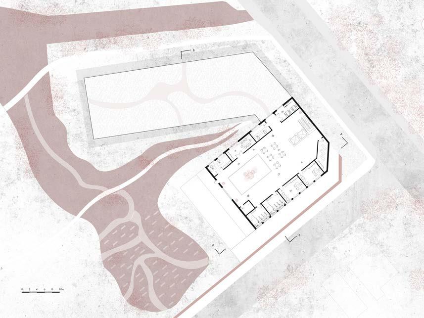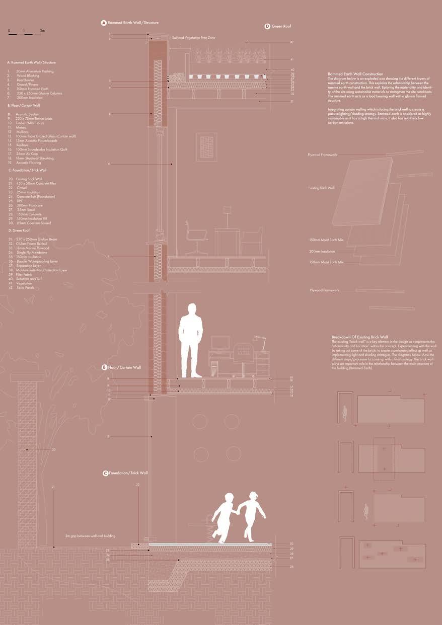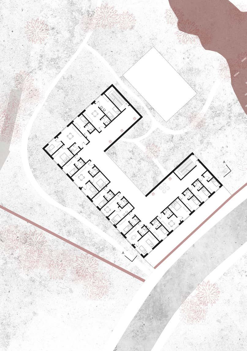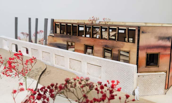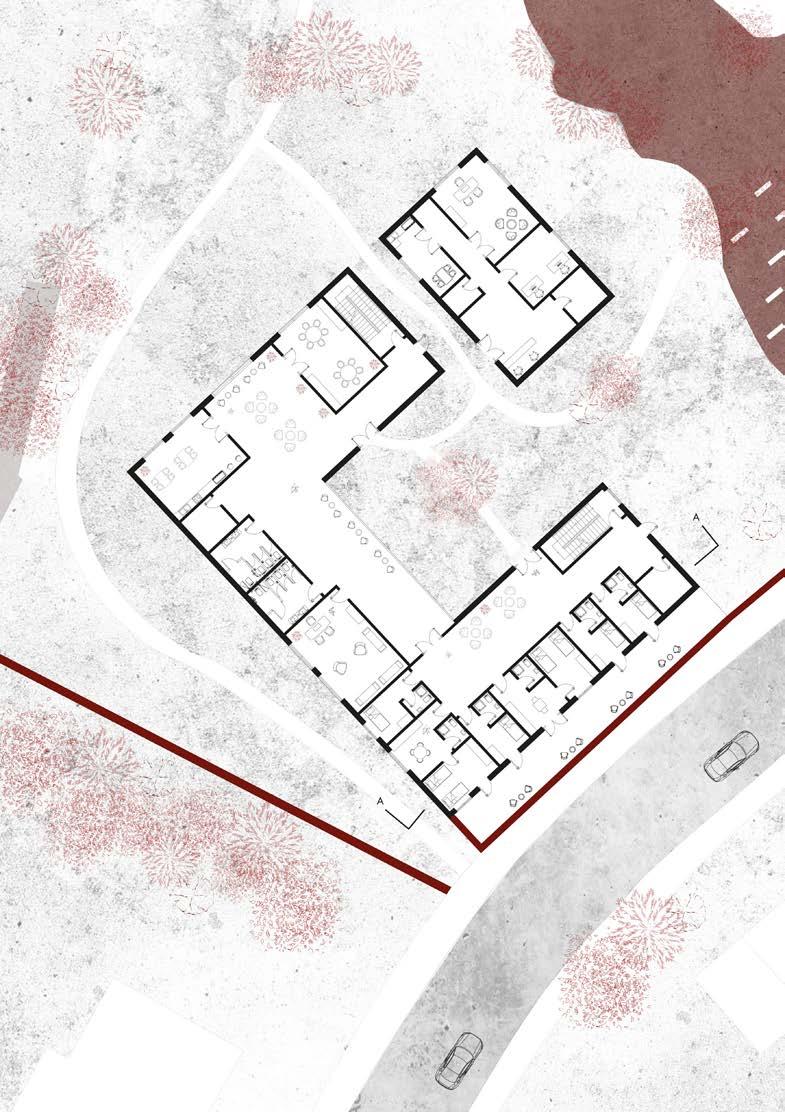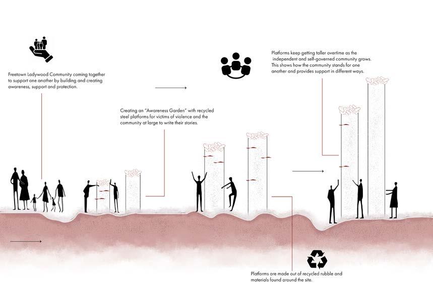 LOCATION MATERIALITY PARTICIPATION The site represents the “Location” within the concept. stores historical identities that can be reflected upon in the design decisions. The identity of Ladywood wll be restored through this concept. The existing brick wall represents the “Materiality”. Keeping the existing brick wall will create a stronger relationship between the site and the existing context. The community represents the “Participation”. This is reflected on the scheme where the community builds platforms in the awareness garden as a space for the victims of violence to share their stories and create awareness. The community also engages with the design process as the notion of “Freetown Ladywood” being an idependent community is applied. Cafe Children’s room Events room Gallery Training and support group Therapy Offices Lounge Meeting rooms Offices Lounge Housing Offices/Reception Lounge/Kitchen Therapy Reading room Housing Ground Floor First Floor Second Floor Community Centre Housing The watch Ground Floor First Floor Site Plan Site Canal Platforms made out of recycled materials Trees