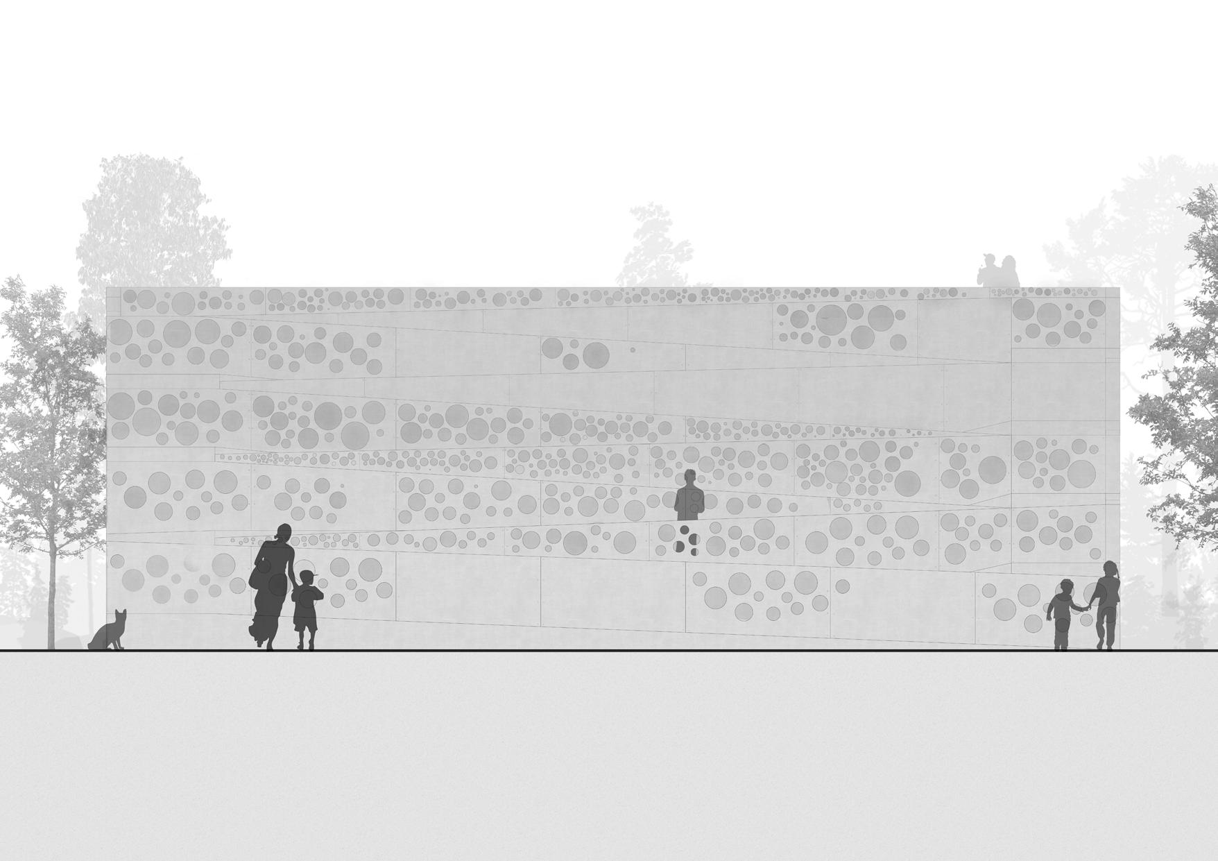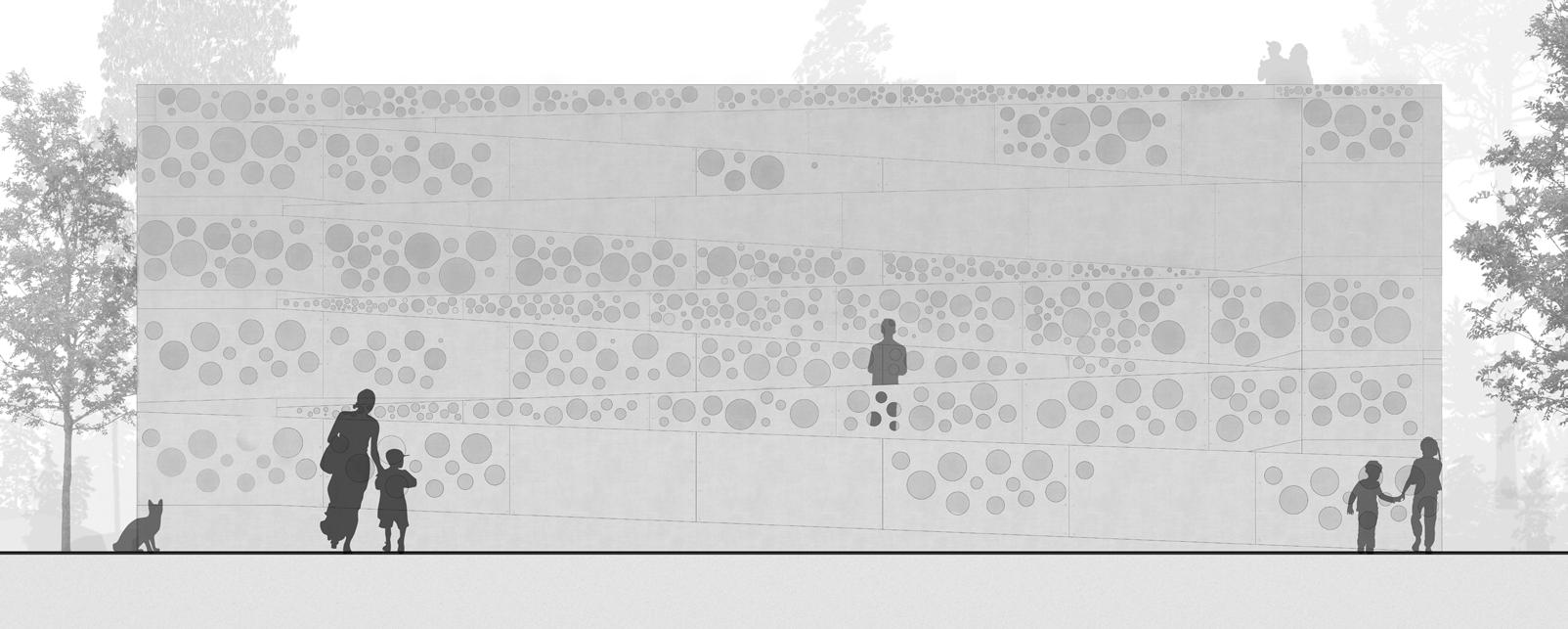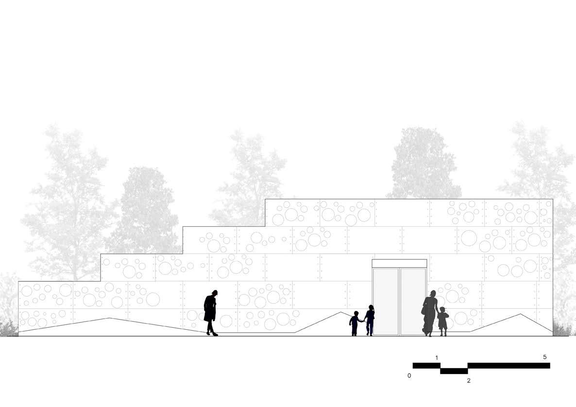 This is the front elevation showing the main entrance to the indoor playground. It also has dappled effect but with the semi dappled perforations. It also shows the different level changes of the ramp.