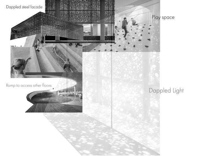 The project shows technical elements as well as building regulations through black-and-white drawings. The design concept is based on four keywords; Ramp, Steel, Playspace and Dappled. These words have been applied to create a design that centres around them. The key material which is steel was used as the primary structure and facade.