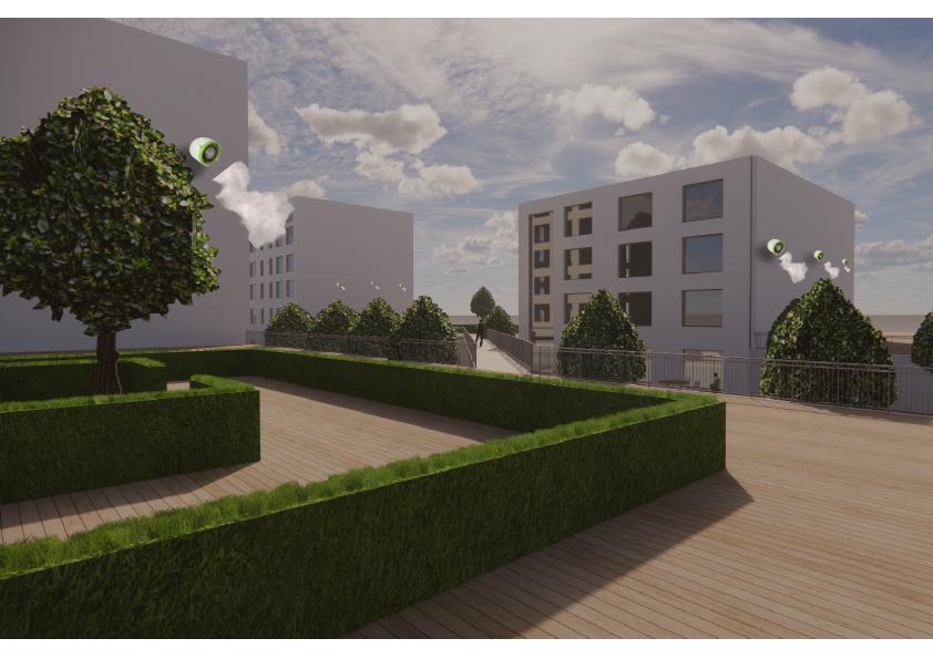 The picture shows the water fan that is provided in the commercial hub to calm the air and encourage outdoor activity during hot weather.