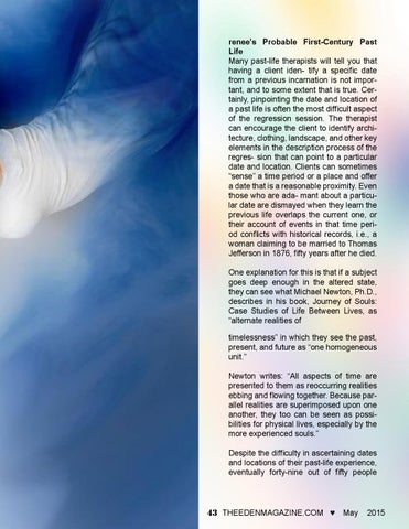 renee’s Probable First-Century Past Life Many past-life therapists will tell you that having a client iden- tify a specific date from a previous incarnation is not important, and to some extent that is true. Certainly, pinpointing the date and location of a past life is often the most difficult aspect of the regression session. The therapist can encourage the client to identify architecture, clothing, landscape, and other key elements in the description process of the regres- sion that can point to a particular date and location. Clients can sometimes “sense” a time period or a place and offer a date that is a reasonable proximity. Even those who are ada- mant about a particular date are dismayed when they learn the previous life overlaps the current one, or their account of events in that time period conflicts with historical records, i.e., a woman claiming to be married to Thomas Jefferson in 1876, fifty years after he died. One explanation for this is that if a subject goes deep enough in the altered state, they can see what Michael Newton, Ph.D., describes in his book, Journey of Souls: Case Studies of Life Between Lives, as “alternate realities of timelessness” in which they see the past, present, and future as “one homogeneous unit.” Newton writes: “All aspects of time are presented to them as reoccurring realities ebbing and flowing together. Because parallel realities are superimposed upon one another, they too can be seen as possibilities for physical lives, especially by the more experienced souls.” Despite the difficulty in ascertaining dates and locations of their past-life experience, eventually forty-nine out of fifty people