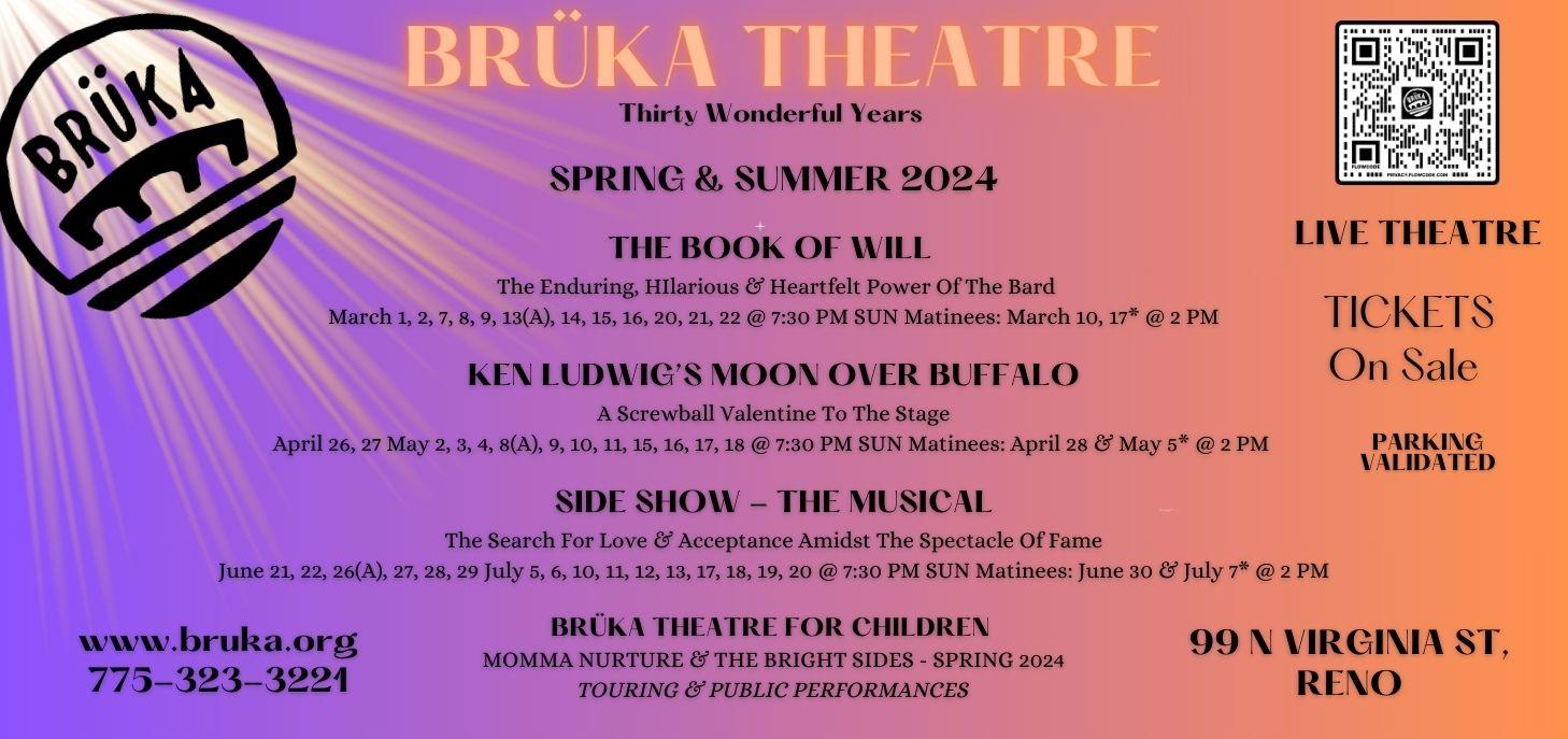 Brüka Theatre is celebrating its 31st season of live theatre in downtown Reno. Brüka’s theme for the 2023/2024 season is: “The Show Must Go On” embracing the excitement and magic of live theatre alongside the fun and challenges that go with creating a show. As an artistic leader in the region, Brüka is recognized for innovative productions, exceptionally talented artists and acclaimed Theatre for Children touring series since its founding in 1992. Central to Brüka is the commitment to the re-investigation of contemporary and classic plays and developing new plays within Brüka’s Artistic Collective, a group that includes winners of the Nevada Arts Council and Sierra Arts Foundation artist grants and nine local best actor honors. Brüka was named “Best Theatre Company” by Reno News and Review for twenty-one years. Brüka is a non-equity, small, not-for-profit member theater company and a liate of the national TCG (Theatre Communications Group). Brüka Theatre has produced over 200 shows in our downtown Reno location. Sign up for our newsletter by going to our website at www.bruka.org.