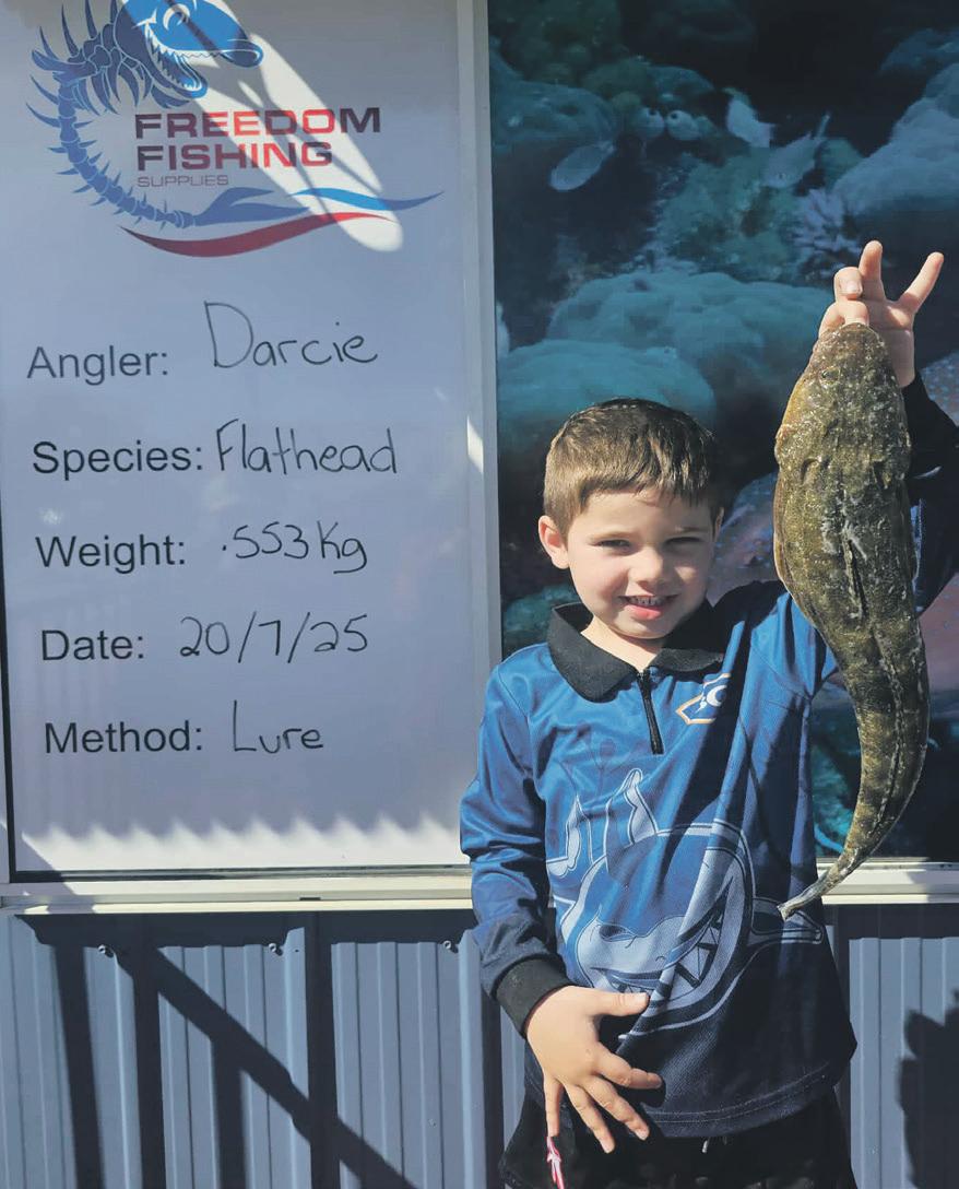 Julie made the most of a glorious winters day and went for a troll in the Strait and scored herself a mackerel and a stonker queenfish. Darcie very proud of has catch. Nice flathead Justin with some quality squid caught at beaver. Austin with a cracker blue salmon .