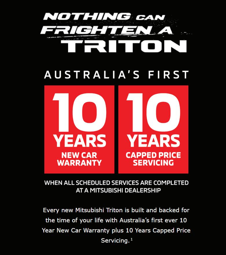 AND, of course, nothing can frighten a Triton - with 4 years road-side assistance*, plus Australia's first 10-Year Warranty, 10 Years Capped Price Servicing'!