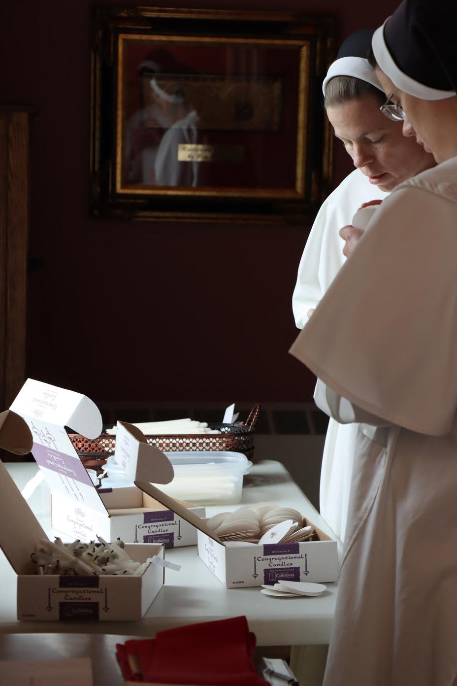 RIGHT/SisterJohnCatherineandSisterCeciliaprepare individualprocessionalcandlesfortheliturgiesof theTriduum.