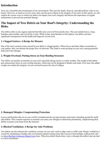 Theimpactoftreedebrisonyourroof'sintegrityshouldnotbeunderestimated.Cloggedgutters,weightoverload, damagedshingles,blockedventilation,critterinfestation,andfirehazardsarejustafewoftherisksassociatedwith neglectingregularmaintenance.Byunderstandingtheserisksandtakingproactivemeasurestopreventandaddress them,youcanensurethelong-termhealthanddurabilityofyourroof.Remembertoconsultwithprofessionalroofing contractorsforanynecessaryinspectionsorrepairstokeepyourhomesafeandsecure.