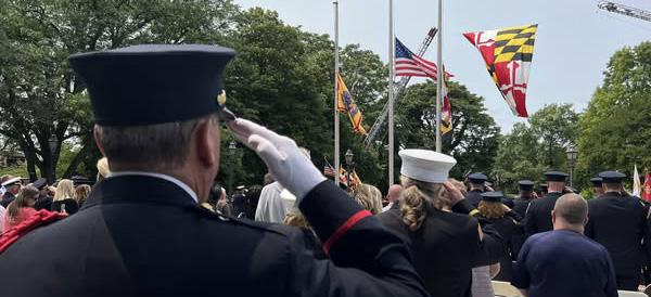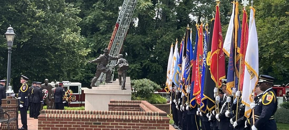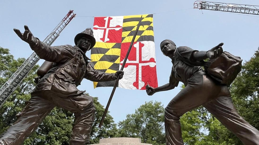 The Maryland Fire-Rescue Services Annual Memorial Service commemorates members of the state's Fire and Rescue services who made the ultimate sacrifice in the performance of their duties. This year saw the addition of five names to the memorial wall, including: Chief Engineer James E. Flynn, Baltimore County Fire Dept.; Master Firefighter Michael T. Warfel, Montgomery County Fire & Rescue Service; Captain Keith A. Phillips, Winfield & Community VFD; Retired Deputy Chief William F. Goddard, III, Prince George’s County Fire/EMS Dept.; and Lieutenant Christopher J. Higgins, Montgomery County Fire & Rescue Service. The approximately one-hour ceremony included a memorial address by Fire Chief Kevin D. Grinder of Naval District Washington Fire & EMS Services and a fly-over by Maryland State Police Aviation Command’s Trooper 2. Learn more at https://www.mdfirerescuehero.org/. n