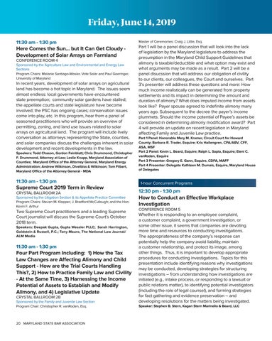 Part 1 will be a panel discussion that will look into the lack of legislation by the Maryland legislature to address the presumption in the Maryland Child Support Guidelines that alimony is taxable/deductible and what option may exist and what arguments may be made as a result. Part 2 will be a panel disucssion that will address our obligation of civility to our clients, our colleagues, the Court and ourselves. Part 3’s presenter will address these questions and more: How much income realistically can be generated from property settlements and its impact in determining the amount and duration of alimony? What does imputed income from assets look like? Payer spouse agreed to indefinite alimony many years ago. Subsequent to the decree the payer’s income plummets. Should the income potential of Payee’s assets be considered in determining alimony modification award? Part 4 will provide an update on recent legislation in Maryland affecting Family and Juvenile Law practice. Part 1 Panel: Honorable Mary M. Kramer, Circuit Court for Howard County; Barbara R. Trader, Esquire; Kris Hallengren, CPA/ABV, CFF, ASA, MSF Part 2 Panel: Kevin L. Beard, Esquire; Ralph L. Sapia, Esquire; Eleni C. vanRoden, Esquire Part 3 Presenter: Gregory E. Gann, Esquire, CDFA, MAFF Part 4 Presenter: Delegate Kathleen M. Dumais, Esquire, Maryland House of Delegates