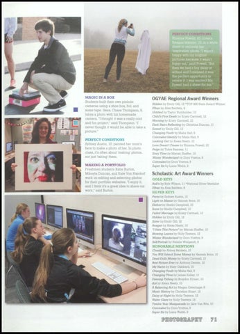 MAGIC IN A BOX Students butlt then own pmhole cameras usmg a shoe box, foil, and some tape Here, Chase Thompson, 9, takes a photo With his homemade camera. "I thought It was a really cool and fun proJect," said Thompson. "I never thought 1t would be able to take a picture." PERFECT CONDITIONS Sydney Austm, 10, pamted her moms face to make a photo of her In photo class, 1t's often about making photos, not JUSt 'taking' them. MAKING A PORTFOLIO Freshmen udents Katie Burt )n, Mtkayla Duncan, and Kate Von Handorf work on edttmg and selectmg photos for the1r portfo!Jo webs1tes. "I enJOY It, and I thmk 11 s a great 1dea to share our work," sa1d Burton.