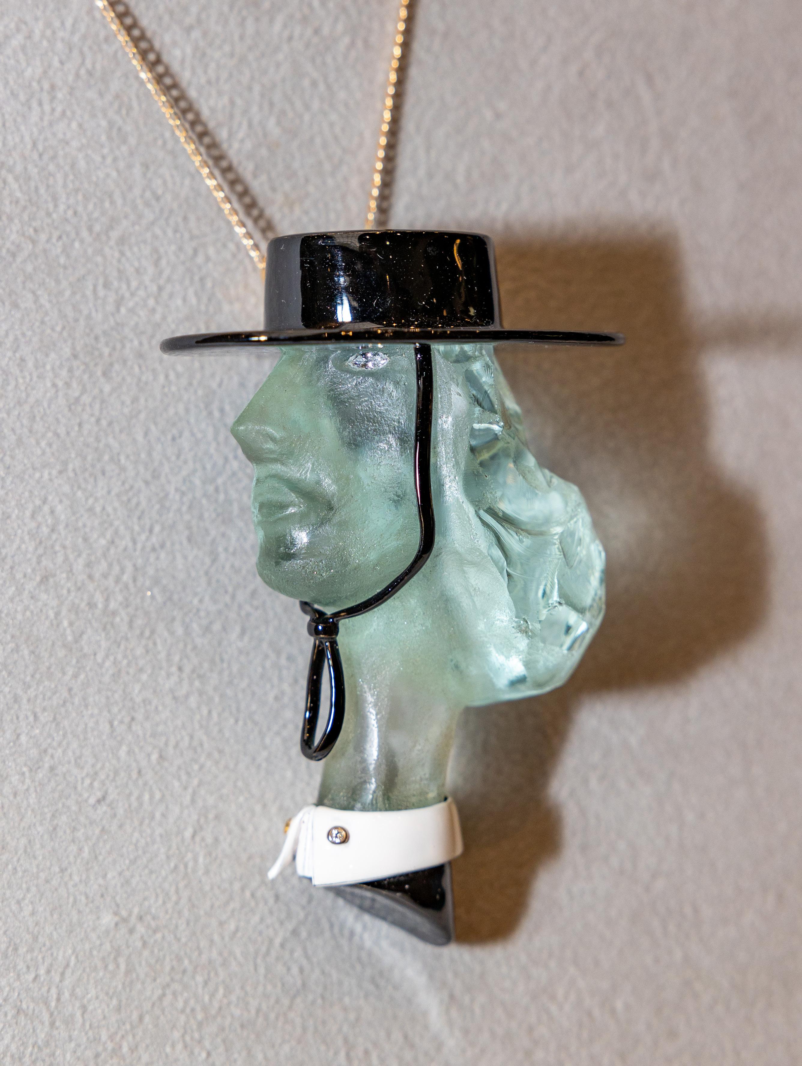 Pascal with “Petit Bouquet” and sculpture, wearing “Horse’s Head” art-to-wear pendant.